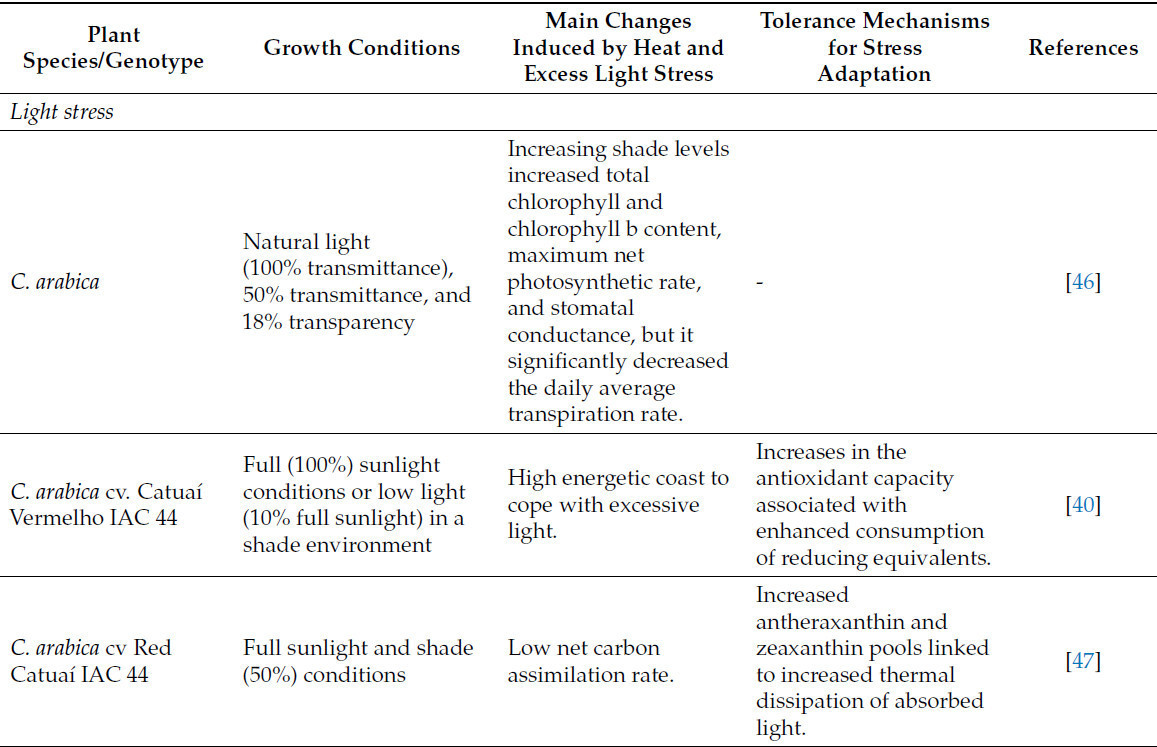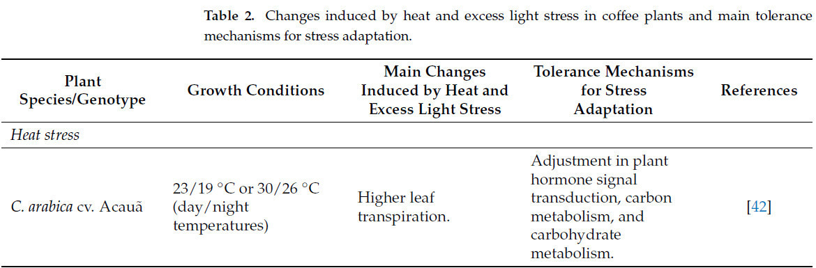 Таблица 2. Изменения, индуцированные стрессом от жары и избыточного света у кофейных растений, и основные механизмы толерантности для адаптации к стрессу.