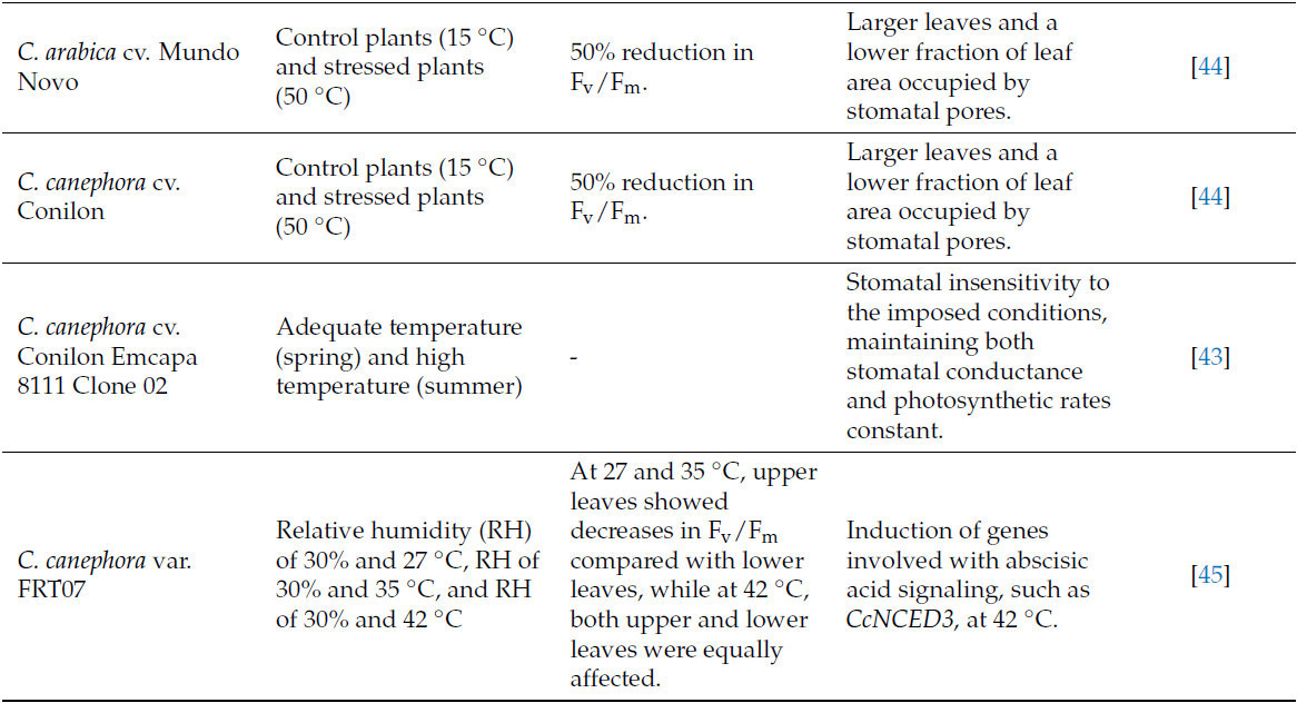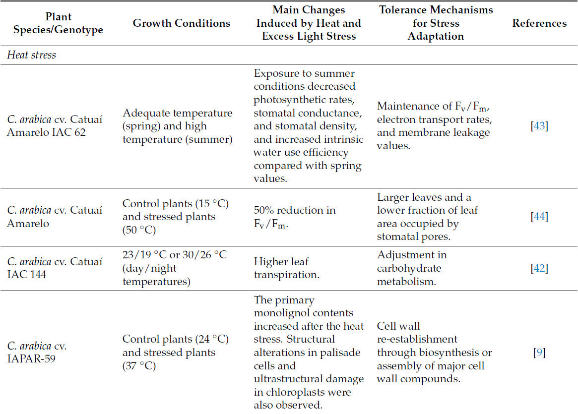 Несмотря на ограниченное количество исследований по данной теме, обобщение существующих знаний может дать ценную информацию о том, как кофейные растения реагируют на такие стрессы. В частности, критически важно понять, способны ли кофейные растения переносить ущерб, вызванный этими стрессами, и какие механизмы они для этого используют. Цель данного обзора — (i) обобщить ключевые выводы о влиянии засухи, жары, избыточного освещения и засоления на кофейные растения и их механизмах адаптации; и (ii) изучить селекцию и питание растений в качестве потенциальных стратегий для смягчения этих абиотических стрессов и повышения продуктивности кофе.