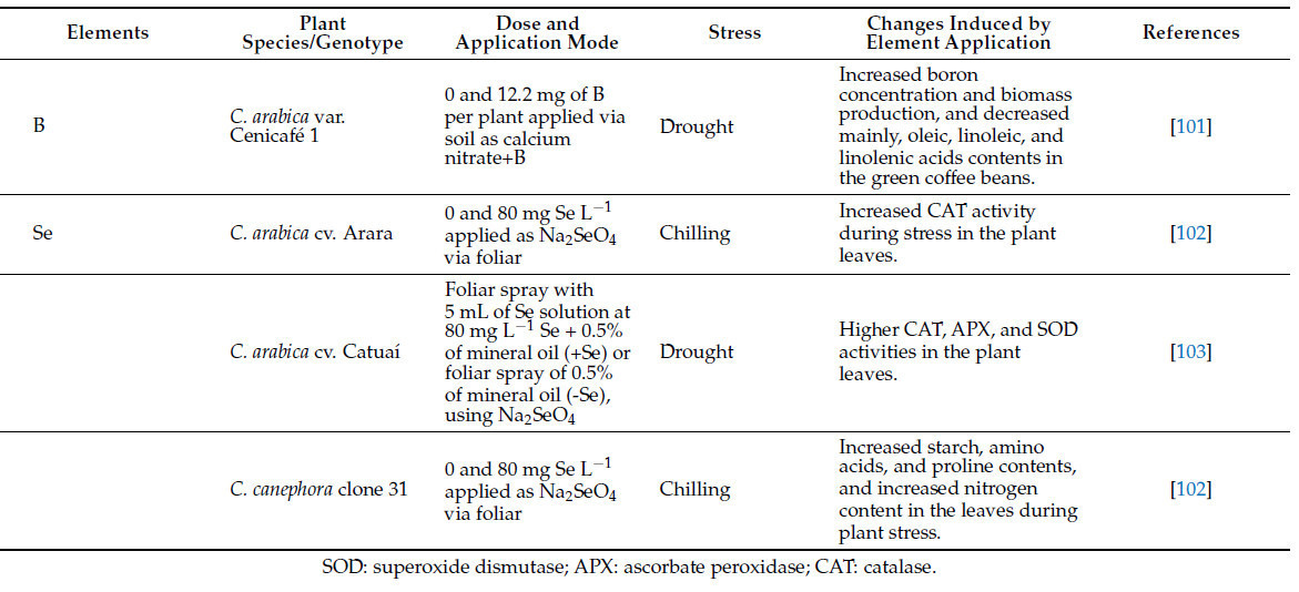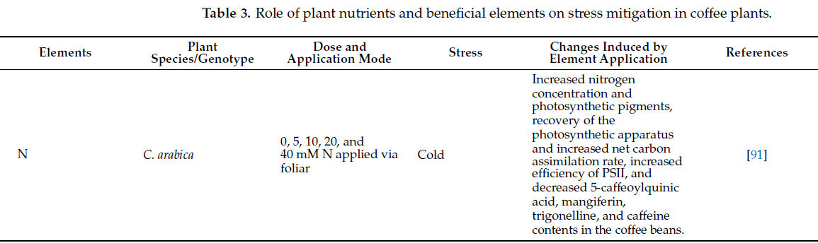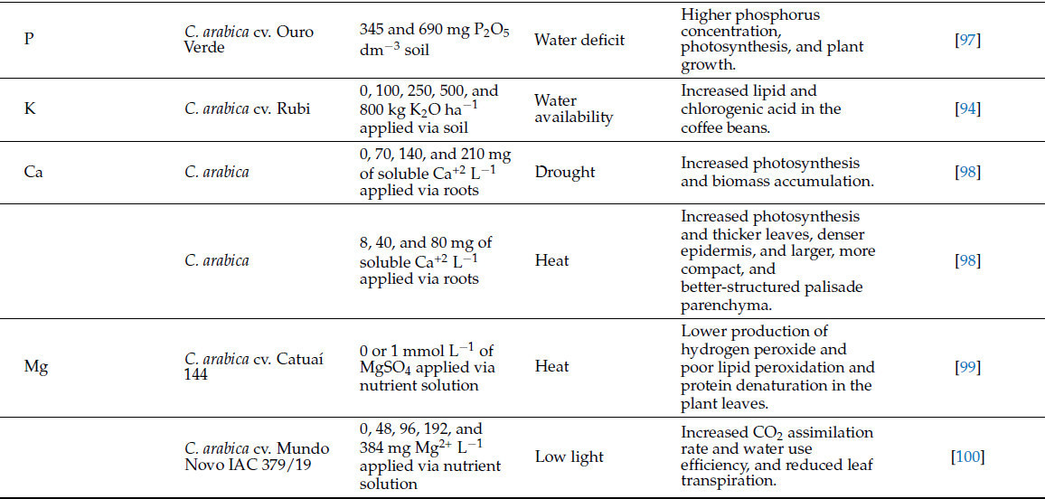 Сообщается, что многие питательные вещества растений смягчают стресс у растений, участвуя в событиях, которые варьируются от восприятия стресса до приобретения толерантности [89]. Например, N участвует в (i) сигнальных процессах через оксид азота, (ii) процессах осморегуляции и активации компонентов антиоксидантной системы и (iii) увеличении пластичности корней для поглощения воды и питательных веществ и в построении углеводов [12]. В свою очередь, P связан с процессами, такими как (i) поддержание тургора клеток и стабильности мембран, (ii) распределение углеводов и корректировка архитектуры корней, и (iii) действие как антиоксидантной, так и фотосинтетической систем [12,89]. Питательные вещества и полезные элементы играют ключевые роли в защите растений от биотических и абиотических стрессов (см. [12]), но некоторые элементы изучались больше, чем другие. Таблица 3 обобщает основные результаты применения питательных веществ и полезных элементов для смягчения стресса растений в производстве кофе. Количество исследований, оценивающих вклад питательных веществ, полезных элементов (Таблица 3) и элементов, не считающихся полезными для растений, таких как йод (I), в смягчение абиотического стресса в производстве кофе, невелико. Однако большинство исследований показали перспективные результаты в отношении повышения устойчивости растений и улучшения качества зерен. Для примера, Андраде и др. [90] сообщили, что применение I (2,5 мг дм³ KIO₃) ослабляло стресс от водного дефицита у C. arabica cv. Catuaí 99 за счет увеличения фотосинтетической эффективности, относительного содержания воды и индекса толерантности к водному дефициту, содержания фотосинтетических пигментов и совместимых осмолитов. Авторы также наблюдали, что применение I стимулировало антиоксидантную ферментативную систему, позволяя более высокую стабильность клеточных мембран. Эти результаты увлекательны, поскольку повреждение клеточных мембран в условиях водного дефицита является важным фактором, приводящим к нарушению ионного гомеостаза у растений [12], что снижает способность растения справляться со стрессом. Питание растений могло бы служить мощным инструментом для смягчения стресса [89]. Дальнейшие исследования необходимы для оценки роли минеральных элементов (включая те, которые традиционно не считаются полезными или необходимыми для растений) в снижении различных типов стресса.