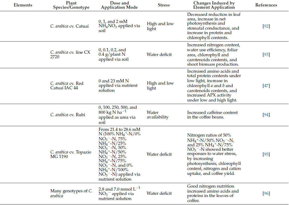 95. Ramirez-Builes, V.H.; Kusters, J.; Thiele, E.; Lopez-Ruiz, J.C. Physiological and Agronomical Response of Coffee to Different Nitrogen Forms with and without Water Stress. Plants 2024, 13, 1387. [Google Scholar] [CrossRef]