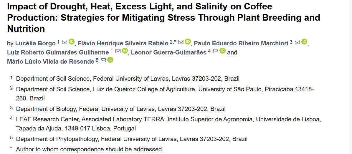 Borgo L, Rabêlo FHS, Marchiori PER, Guilherme LRG, Guerra-Guimarães L, Resende MLVd. Impact of Drought, Heat, Excess Light, and Salinity on Coffee Production: Strategies for Mitigating Stress Through Plant Breeding and Nutrition. Agriculture. 2025; 15(1):9. https://doi.org/10.3390/agriculture15010009