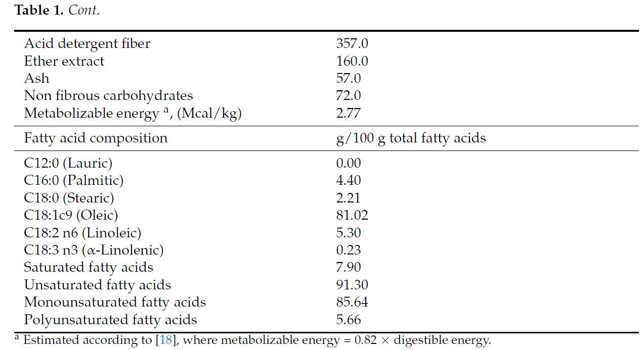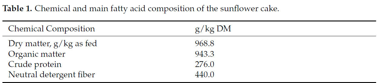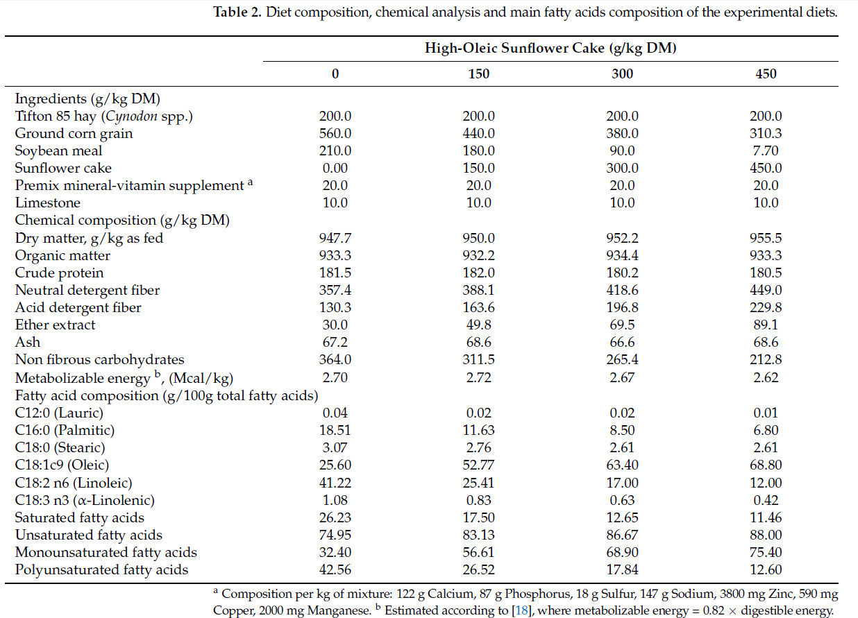 Тридцать шесть ярочек (½ Санта-Инес × ½ Дорпер, случайно отобранных из большего стада), с начальной живой массой 21,52 ± 0,27 кг и начальным возрастом 138 ± 2,62 дня, были индивидуально размещены в крытых загонах (1 м2). Эксперимент был проведен в соответствии с полностью рандомизированной схемой. Животные были распределены по четырем обработкам, всего по 9 повторностей на обработку, которые состояли из включения высокоолеинового подсолнечного жмыха (Таблица 1) в пропорциях 0, 150, 300 и 450 г/кг СВ (Таблица 2). Рационы были рассчитаны как изопротеиновые (181 г/кг СВ) с соотношением грубые корма:концентраты 20:80. Рационы были сформулированы для удовлетворения питательных потребностей ярочек с живой массой 20 кг и средним суточным приростом 250 г, в соответствии с National Research Council [18]. Подсолнечный жмых был получен методом холодного прессования семян высокоолеинового подсолнечника от бразильской компании (Parecis Alimentos S/A, Кампу-Нову-ду-Паресис, Бразилия).