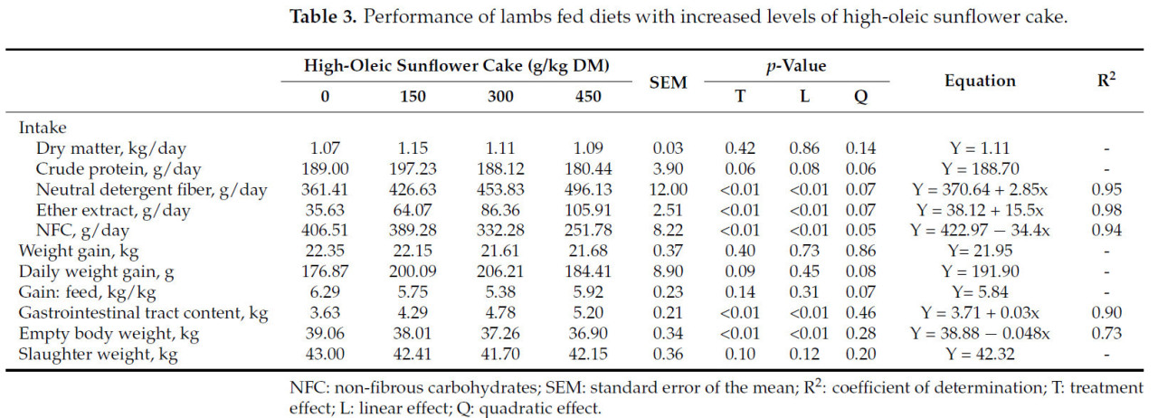 Таблица 3. Продуктивность ягнят, получавших рационы с возрастающими уровнями высокоолеинового подсолнечного жмыха.