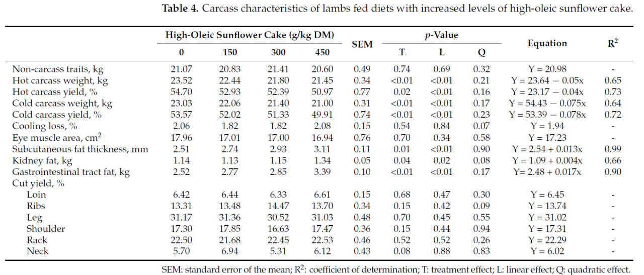 Таблица 4. Характеристики туш ягнят, получавших рационы с возрастающими уровнями высокоолеинового подсолнечного жмыха.