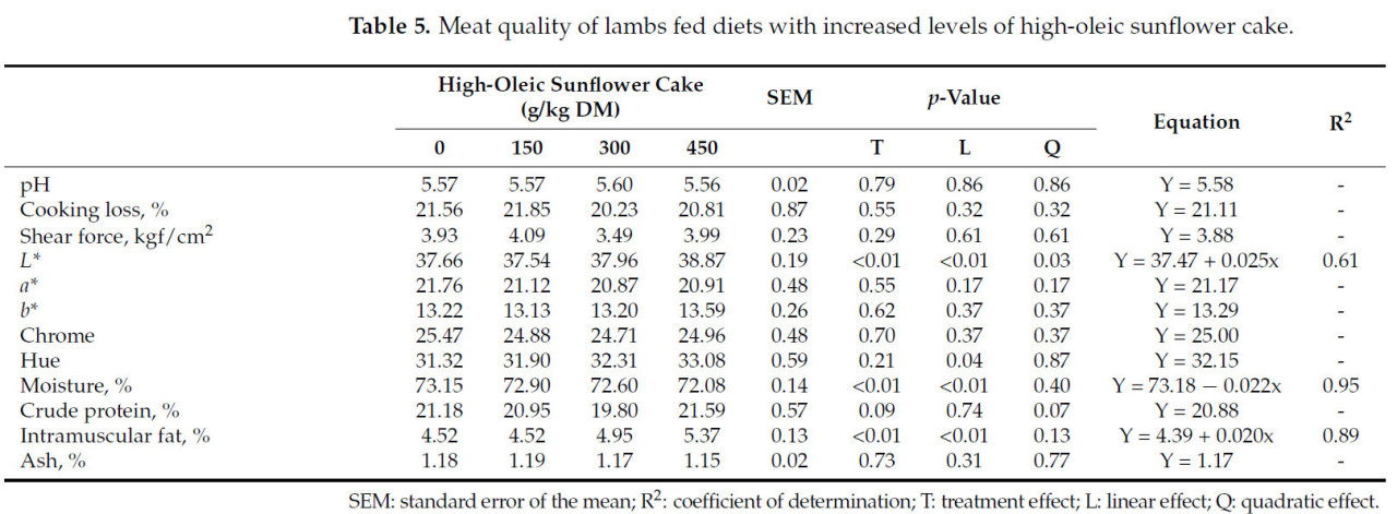 Прогресс в применении подсолнечного жмыха привлекает все больше внимания как жизнеспособного ингредиента в питании жвачных благодаря благоприятному питательному профилю и доступности. Высокоолеиновый подсолнечный жмых может быть высокоэнергетическим кормовым ингредиентом в рационе ягнят на откорме и улучшать профиль жирных кислот в мясе, обеспечивая прямое депонирование мононенасыщенных жирных кислот и, через биогидрогенизацию, превращаясь в стеариновую кислоту, которая оказывает защитный эффект против сердечно-сосудистых заболеваний [15]. Однако из-за содержания жира, связанного с количеством клетчатки в подсолнечном жмыхе, уровни включения этого побочного продукта в рацион могут снижать потребление сухого вещества и продуктивность животных [2,16], в то время как другие исследования показали, что включение подсолнечного жмыха может поддерживать потребление, баланс азота и параметры рубцового брожения [17]. Учитывая это, целью настоящего исследования была оценка эффектов возрастающих уровней высокоолеинового подсолнечного жмыха (0, 150, 300 и 450 г/кг СВ) в рационе помесных ягнят на откорме на их продуктивность, характеристики туши, качество мяса (pH, цвет, усилие сдвига и состав) и состав внутримышечных жирных кислот.