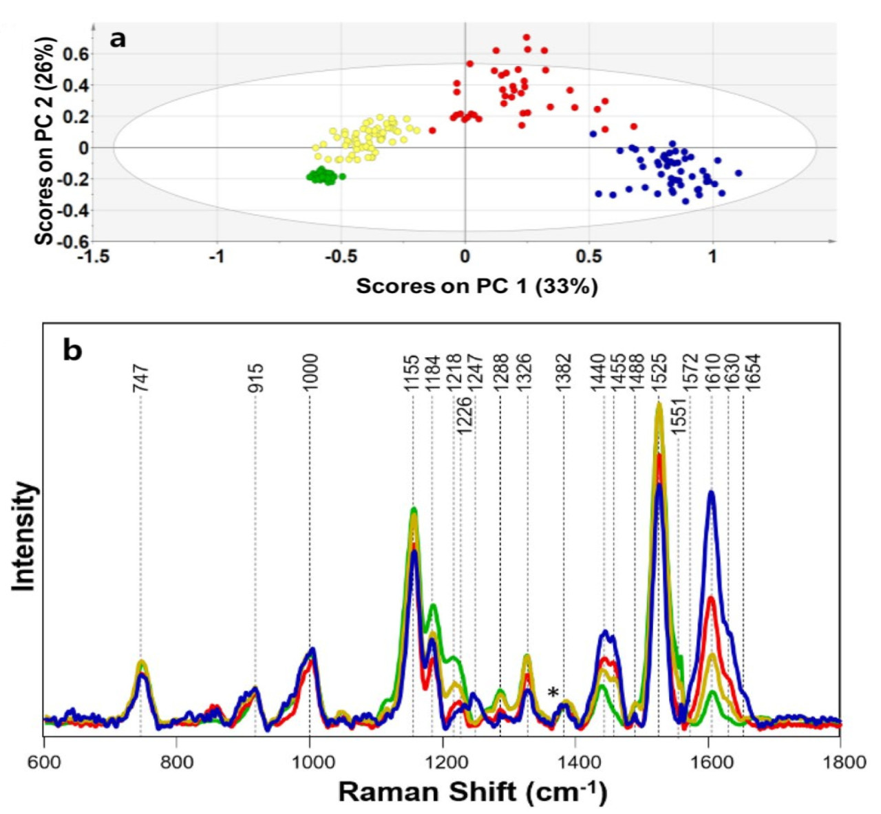 Грейпфрут имеет большой объем, и платформа хранения традиционных Раман-спектрометров не может вместить весь плод, что препятствует сбору полного рамановского сигнала от целого фрукта. Однако портативные Раман-спектрометры, которые позволяют быстро сканировать образцы с помощью портативного лазерного зонда, могут быстро собирать Раман-спектры. Поэтому портативные Раман-спектрометры используются для раннего обнаружения Хуанлунбин у грейпфрута. На основе Раман-спектров стандартных веществ, Sanchez и др. [92] наблюдали, что вариация интенсивности характеристических пиков Рамана органических соединений в грейпфруте находится под влиянием HLB. Разработав модель обнаружения ортогонального дискриминантного анализа частичных наименьших квадратов (OPLS-DA), точность обнаружения HLB достигла 96.7%, превзойдя метод ПЦР. Диаграмма Раман-спектров и модели OPLS-DA грейпфрута в различных состояниях показана на Рисунке 12, в то время как характеристические рамановские полосы грейпфрута перечислены в Таблице 7. Обнаружение болезни служит основой для классификации болезней и предоставляет научную основу для управления болезнями растений. Используя Раман-данные грейпфрута, исследовательская группа разработала модель OPLS-DA, которая достигла 98% точности в различении здорового грейпфрута от инфицированного HLB и 100% точности в дифференциации ранней и поздней стадий инфекции HLB [93].