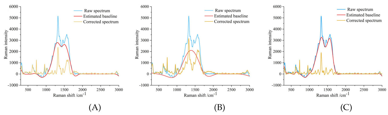Когда лазерный свет облучает образец, флуоресцентные материалы внутри образца поглощают фотоны и испускают флуоресценцию, вызывая дрейф базовой линии в Раман-спектре. Флуоресцентные помехи затмевают правильное спектральное распределение, влияя на идентификацию и анализ рамановских пиков. Коррекция базовой линии используется для восстановления исходного спектра, с общими подходами, включая полиномиальную аппроксимацию и мультивариантную коррекцию рассеяния [51,52].