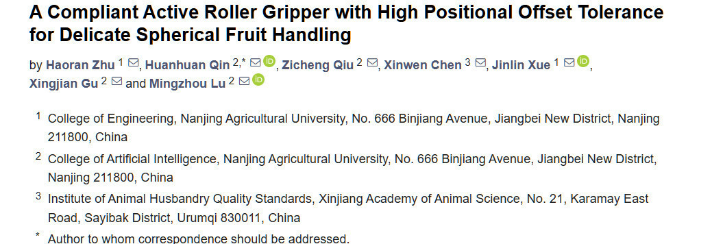 Zhu H, Qin H, Qiu Z, Chen X, Xue J, Gu X, Lu M. A Compliant Active Roller Gripper with High Positional Offset Tolerance for Delicate Spherical Fruit Handling. Agriculture. 2025; 15(2):220. https://doi.org/10.3390/agriculture15020220