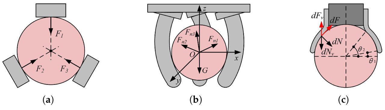 Рисунок 1. Типичные модели взаимодействия между захватами и сферическими фруктами. На примере трехпальцевых захватов. 𝐹1, 𝐹2 и 𝐹3 на (a) — это силы, оказываемые тремя жесткими пальцами. 𝐹𝑛1, 𝐹𝑛2 и 𝐹𝑛3 на (b) — это результирующие силы, оказываемые тремя мягкими пальцами. 𝑑𝑁 и 𝑑𝐹 на (c) — это нормальная сила и сила трения, 𝑑𝑁𝑣 и 𝑑𝐹𝑣 — их вертикальные составляющие, а 𝜃1 и 𝜃2 представляют нижнюю и верхнюю точки контакта. (a) Модель "жесткий захват–фрукт". (b) Модель "мягкий захват–фрукт". (c) Модель "вакуумный всасывающий захват–фрукт".