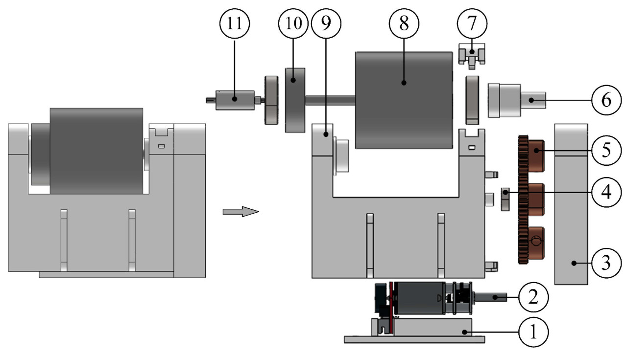 Рисунок 3. Вид в разобранном виде блока активного ролика. (1) Крышка двигателя, (2) микро двигатель постоянного тока, (3) боковая крышка блока, (4) подшипник, (5) зубчатая передача, (6) соединитель катушки, (7) крышка подшипника, (8) активный ролик, (9) корпус блока, (10) катушка и (11) контактное кольцо.