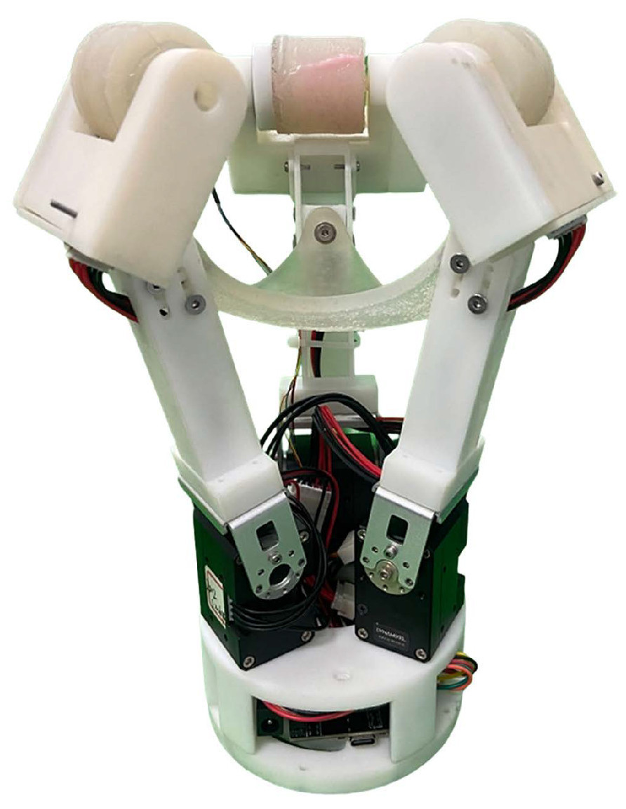 Общая структура предложенного захвата показана на Рисунке 2. Захват в основном включает основание, мягкую опорную мембрану, встроенный блок управления и три пальца. Каждый палец имеет две степени свободы (DoF) и состоит из умного привода, звена и блока активного ролика. Основание представляет собой двухслойную структуру с отверстиями в верхнем слое для соединения с умными приводами и отверстиями в нижнем слое для роботизированной руки. Пространство между двумя слоями используется для размещения встроенного блока управления. Умные приводы (XM430-W350-R, Dynamixel, Корона, Калифорния, США) с передаточным числом 353,5 приняты для привода звеньев через фланцы. Сменные блоки активных роликов расположены на концах звеньев для улучшения ремонтопригодности. При сотрудничестве умных приводов, звеньев и роликовых блоков фрукты могут обрабатываться плавно. Мембрана отлита с использованием силиконового геля с твердостью по Шору А 15. Она достаточно мягкая, чтобы поддерживать и ограничивать фрукты разных размеров, когда они полностью перемещаются в захват. Встроенный блок управления в основном включает микроконтроллер (ATmega2560, Microchip, Чандлер, Аризона, США), модуль управления питанием, модуль интерфейса TTL в RS-485 и три драйвера двигателей постоянного тока. Захват может работать правильно при подаче питания постоянного тока (12 В).