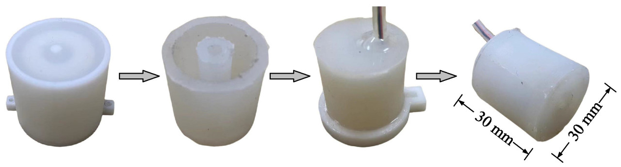 Когда захват входит в контакт с фруктом, активный ролик сжимается. Предполагая, что масса воздуха внутри ролика постоянна, изменение объема воздуха приведет к изменению давления в ролике, которое можно дальнейшее измерить с помощью датчика давления. Изготовление активного ролика разделено на два этапа (как показано на Рисунке 5). Следовательно, форма также разделена на две части. Сначала силиконовый гель с твердостью по Шору А 20 медленно впрыскивается в форму 1 для создания основного тела активного ролика. После того как силиконовый гель полностью затвердеет, форма 1 удаляется, и датчик давления интегрируется в основное тело активного ролика с помощью силиконовой трубки с внешним диаметром 4 мм. Провода датчика проходят через силиконовую трубку и подключаются к микроконтроллеру. Затем силиконовый гель заливается в форму 2, и основное тело активного ролика вместе с датчиком помещается в форму 2 для формирования герметичного пространства. Изготовленный ролик имеет диаметр 30 мм и длину 30 мм. Стоит упомянуть, что для получения хороших герметизирующих свойств силиконовую трубку необходимо герметизировать силиконовым гелем.