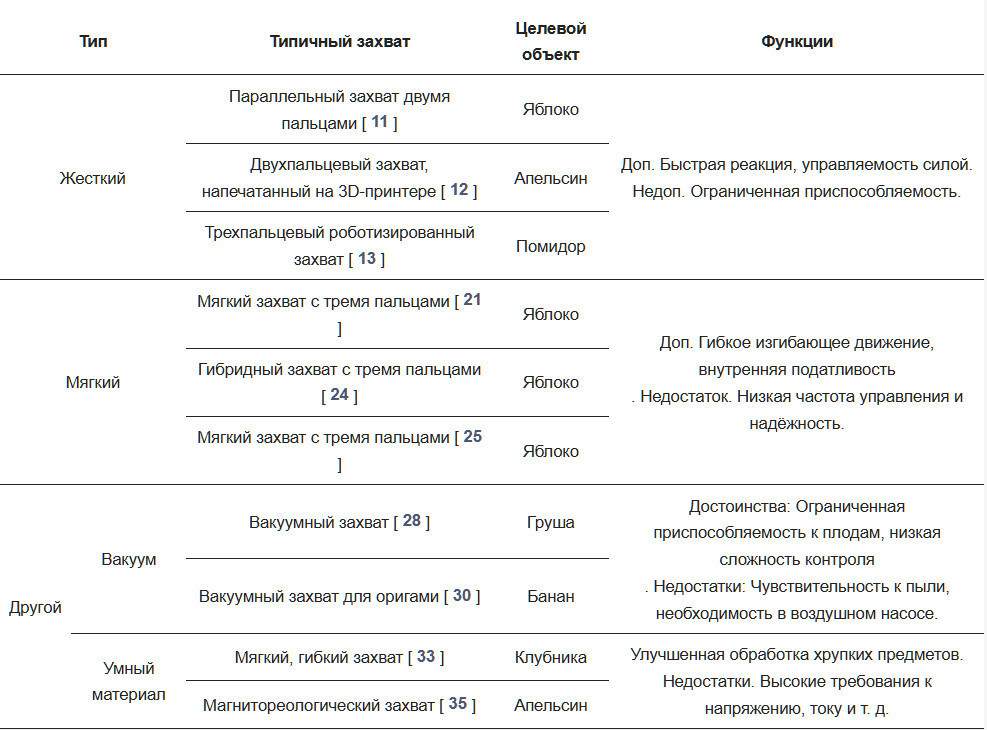 Фрукты играют важную роль в питании и здоровье человека, особенно как источник витаминов, минералов и пищевых волокон [1]. Мировое производство свежих фруктов уже достигло 909,64 миллиона метрических тонн в 2021 году. В настоящее время масштабы выращивания и производства фруктов все еще растут. Роботы для обработки сельскохозяйственной продукции стали важнейшим компонентом фруктовой индустрии [2,3]. Роботизированные захваты (также называемые концевыми эффекторами) выступают в качестве конечных механизмов сельскохозяйственных роботов [4,5,6,7]. Они непосредственно взаимодействуют с фруктами, и их производительность оказывает большое влияние на эффективность обработки и процент повреждения фруктов [8]. При работе с нежными фруктами захваты должны демонстрировать высокую адаптивность, гибкость и точность, чтобы минимизировать повреждение продукции.