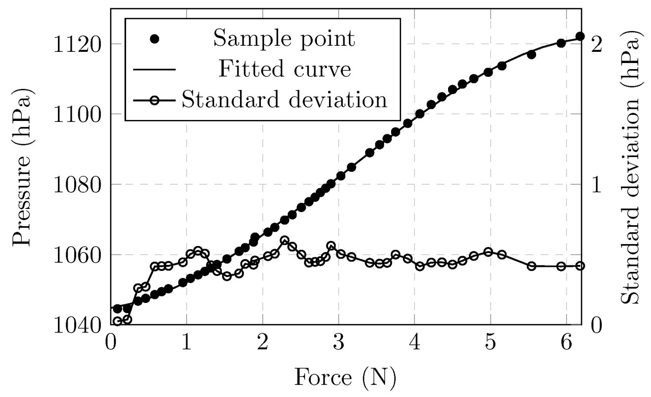 Для количественного определения зависимости "сила-давление" ролик был откалиброван на испытательном стенде "сила-перемещение" (как показано на Рисунке 6). Внешняя сила может медленно прикладываться к ролику путем вращения колеса стенда, и сила записывается в реальном времени с помощью силомера (ZTS-50N, IMADA Inc., Тоёхаси, префектура Айти, Япония). В эксперименте калибровки начальное давление в ролике составляло 1044,57 гПа. Эксперимент по калибровке повторялся три раза, и среднее значение вычислялось как окончательный результат. Результат калибровки показан на Рисунке 7. Зависимость "сила-давление" может быть выражена как