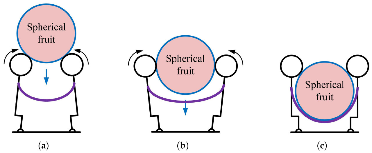 Этапы выполнения захвата можно разделить на три стадии (как показано на Рисунке 8). На стадии контакта захват управляется для легкого прикосновения к объекту под заданным углом раскрытия. Когда прикосновение обнаружено, активные ролики активируются для вращения с заданной скоростью. Затем фрукт начинает перемещаться в сторону захвата за счет трения (как показано на Рисунке 8а). Стадия перемещения следует за стадией контакта. На этой стадии, по мере перемещения фрукта, умный привод активируется для приложения стабильного желаемого усилия к фрукту, и угол раскрытия захвата постепенно увеличивается, чтобы облегчить процесс перемещения (как показано на Рисунке 8b). Когда фрукт полностью перемещен в захват, активные ролики прекращают вращение, и умный привод блокируется, чтобы наложить ограничения на фрукт (как показано на Рисунке 8c).