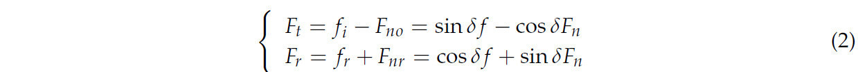 где 𝛿 — угол между 𝐹𝑛𝑜 и 𝐹𝑛. f может быть вычислена как 𝑓=𝜇𝑙 𝐹𝑛, где 𝜇𝑙 — коэффициент трения. Учитывая механическую взаимосвязь между захватом и фруктом, можно получить следующее уравнение: