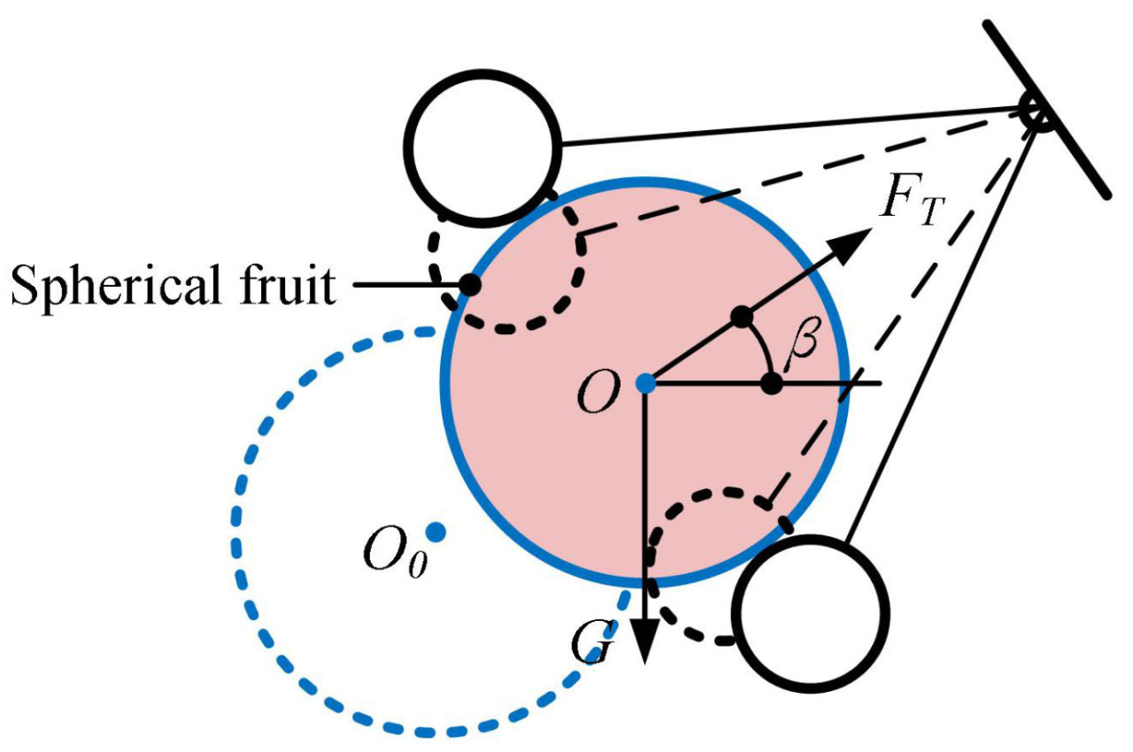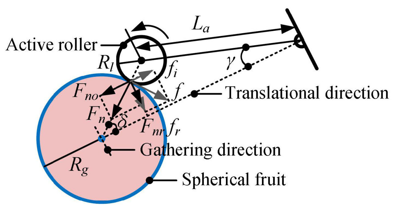 Совместная работа звеньев и активных роликов обеспечивает силу перемещения, которая оказывает большое влияние на то, может ли фрукт быть обработан плавно. Эта сила перемещения определяется множеством факторов, таких как угол раскрытия захвата, коэффициент трения ролика и крутящий момент умного привода. Конкретный силовой анализ одиночного ролика на фрукте показан на Рисунке 9. Одиночный ролик оказывает две силы на фрукт: нормальную силу 𝐹𝑛 и силу трения f. 𝐹𝑛 может быть разложена на 𝐹𝑛𝑟 и 𝐹𝑛𝑜 вдоль направления перемещения. Аналогично, f может быть разложена на 𝑓𝑟 и 𝑓𝑖. Предположим, что эквивалентная длина звена равна 𝐿𝑎, а радиусы ролика и фрукта равны 𝑅𝑙 и 𝑅𝑔 соответственно; тогда воздействие одиночного ролика на фрукт можно рассматривать как силу перемещения 𝐹𝑡 и силу сбора 𝐹𝑟, которые дальнейшее выражаются как