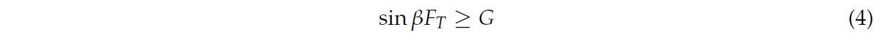 𝐹𝑡 и 𝐹𝑟 будут заставлять фрукт двигаться вдоль направления перемещения и направления сбора соответственно (как показано на Рисунке 9). Рассматривая захват с n равномерно расположенными роликами, результирующая сила всех сил сбора будет равна нулю, а результирующая сила всех сил перемещения равна 𝐹𝑇, которая может быть вычислена как 𝐹𝑇=𝑛 𝐹𝑡. Предположим, что захват приближается к фрукту под заданным углом 𝛽, который является углом между захватом и горизонтальным направлением. Как показано на Рисунке 10, угол 𝛽 также является углом между 𝐹𝑇 и горизонтальным направлением. Для успешной обработки фрукта можно получить следующее уравнение:
