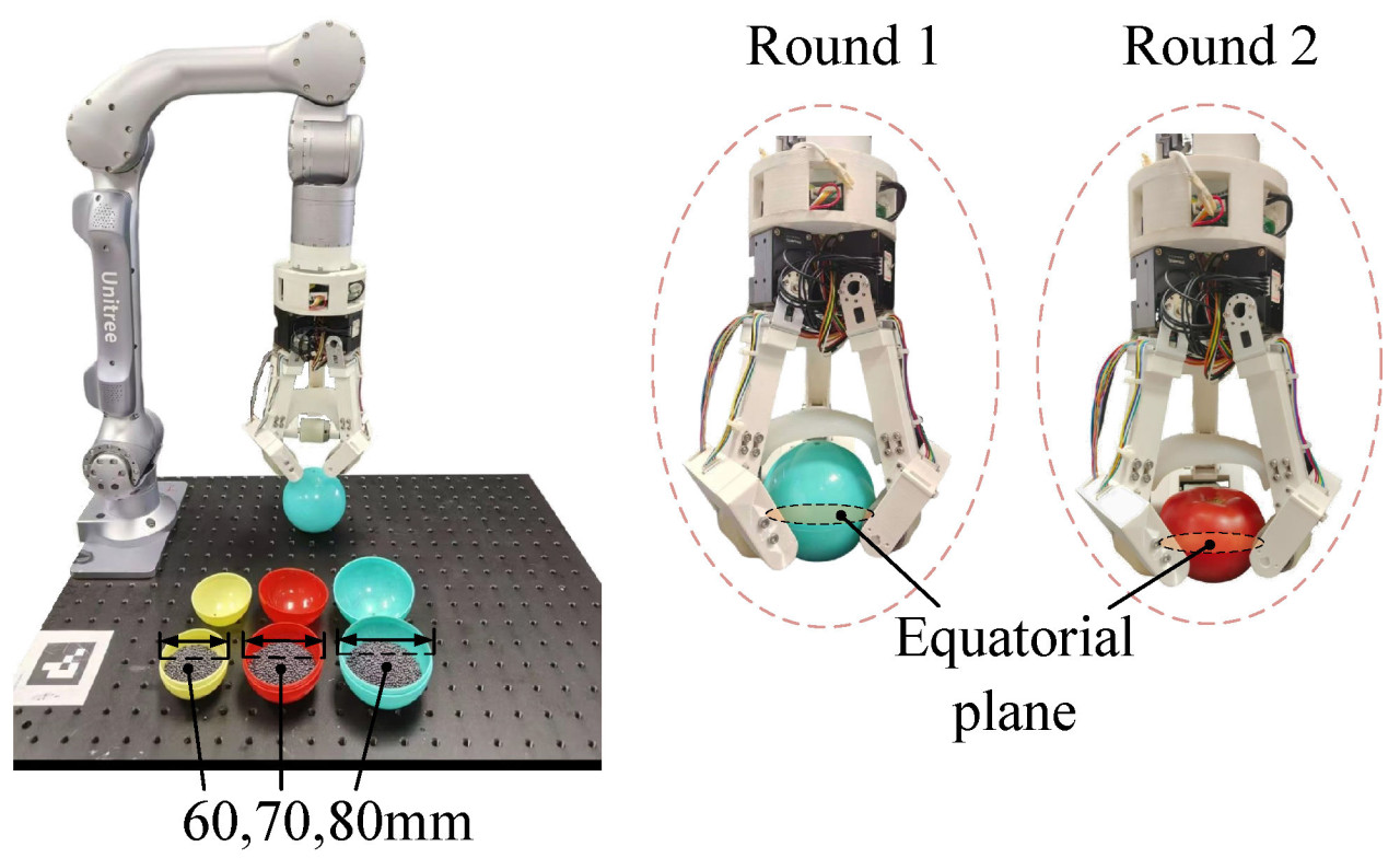 В первом раунде целью было определить максимальный захватываемый вес (𝐺𝑊𝑚𝑎𝑥) захвата при разных комбинациях 𝜔 и 𝜏. Как показано на Рисунке 11, захват был установлен на конце роботизированной руки (Z1, Unitree). В качестве целевых объектов использовались пластиковые шары диаметром 60, 70 и 80 мм, и их вес можно было регулировать, заполняя их свинцовой дробью. Роботизированная рука управлялась для перемещения из позиции A (10 см непосредственно над экваториальной плоскостью целевого объекта) в позицию B, которая являлась экваториальной плоскостью целевого объекта. Затем рука возвращалась в позицию A, удерживалась в течение одной секунды и subsequently возвращала целевой объект в позицию B. Для определения 𝐺𝑊𝑚𝑎𝑥 для каждой пары 𝜔−𝜏 применялся метод двоичного поиска для постепенной регулировки веса шара, пока не была идентифицирована 𝐺𝑊𝑚𝑎𝑥. 𝜔 устанавливалась на 20, 40, 60, 80, 100 и 120 об/мин, а 𝜏 устанавливался на 50, 80, 110, 140, 170 и 200 мН·м. Значения 20 об/мин и 50 мН·м были минимальными значениями, необходимыми для привода захвата, тогда как заметное повреждение томатов происходило, когда 𝜔 превышала 120 об/мин или 𝜏 превышал 200 мН·м. 𝐺𝑊𝑚𝑎𝑥 выбирался как максимальный вес, который мог быть успешно захвачен пять раз для каждой пары 𝜔−𝜏. Попытка считалась успешной, если целевой объект был захвачен и не упал.