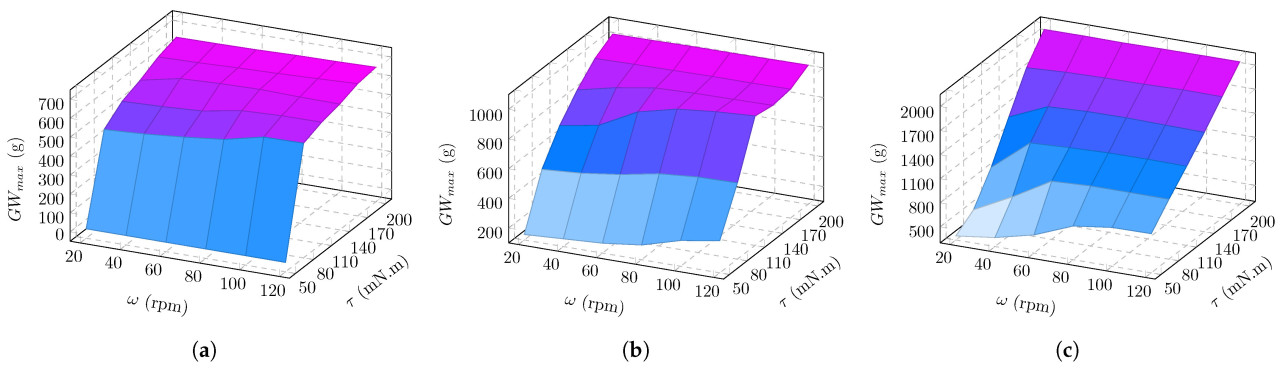 Результаты Раунда 1 показаны на Рисунке 12. В целом, 𝜏 оказывает значительное влияние на 𝐺𝑊𝑚𝑎𝑥 захвата. Для заданной 𝜔, 𝐺𝑊𝑚𝑎𝑥 значительно увеличивается с ростом 𝜏. В contrast, 𝜔 имеет относительно слабое влияние на 𝐺𝑊𝑚𝑎𝑥 захвата. Для заданного 𝜏, рост 𝐺𝑊𝑚𝑎𝑥 ограничен по мере увеличения 𝜔. Принимая Рисунок 12b в качестве примера, при заданной скорости 60 об/мин, соответствующий 𝐺𝑊𝑚𝑎𝑥 увеличивается с 167 г при 40 мН·м до 1032 г при 200 мН·м, что представляет собой увеличение на 518%, в то время как при заданном крутящем моменте 110 мН·м, соответствующий 𝐺𝑊𝑚𝑎𝑥 увеличивается с 685 г при 20 об/мин до 973 г при 120 об/мин, показывая увеличение только на 42%. Как показано на Рисунке 12a–c, для пластиковых шаров диаметром 60 мм, 70 мм и 80 мм, соответствующие максимальные значения 𝐺𝑊𝑚𝑎𝑥 все возникают при 120 об/мин – 200 мН·м, достигая 662 г, 1038 г и 2077 г соответственно.
