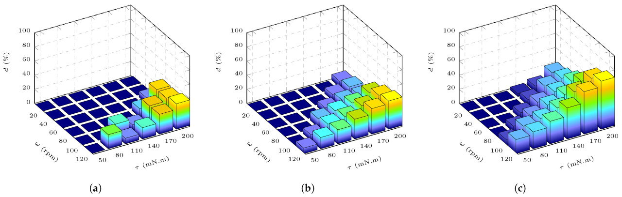 Результаты Раунда 2 показаны на Рисунке 13. Основываясь на данных на Рисунке 13a–c, за определенными пределами, d показывает очевидную восходящую тенденцию с увеличением как 𝜔, так и 𝜏. При обработке томатов диаметром 55–65 мм (как показано на Рисунке 13a), при скорости ролика 80 об/мин, соответствующий d составляет 0% при 50, 80, 110 и 140 мН·м, затем увеличивается до 12% при 170 мН·м и, наконец, достигает максимального значения 32% при 200 мН·м. При крутящем моменте привода 140 мН·м, соответствующий d составляет 0% при 20, 40, 60 и 80 об/мин, затем увеличивается до 8% при 100 об/мин и, наконец, достигает максимального значения 16% при 120 об/мин. Предел пары 𝜔−𝜏 между 𝑑=0 и 𝑑≠0 составляет 120 об/мин–50 мН·м, 100 об/мин–80 мН·м, 80 об/мин–110 мН·м, 80 об/мин–140 мН·м, 60 об/мин–170 мН·м и 40 об/мин–200 мН·м. Аналогично, предел пары 𝜔−𝜏 на Рисунке 13b составляет 100 об/мин–50 мН·м, 80 об/мин–80 мН·м, 60 об/мин–110 мН·м, 40 об/мин–140 мН·м и 20 об/мин–170 мН·м. Рисунок 13c имеет предел пары 𝜔−𝜏 80 об/мин–50 мН·м, 60 об/мин–80 мН·м, 40 об/мин–110 мН·м и 20 об/мин–110 мН·м. При 120 об/мин–200 мН·м, максимальные значения d для томатов с диаметрами 55–65 мм, 65–75 мм и 75–85 мм составляют 36%, 40% и 68% соответственно. Кроме того, во время эксперимента наблюдались некоторые выбросы, такие как d томатов с диаметром 55–65 мм при 120 об/мин–80 мН·м и 100 об/мин–110 мН·м, и d томатов с диаметром 65–75 мм при 60 об/мин–200 мН·м. Это могло быть из-за нестабильности выходного крутящего момента, вызванной длительной работой умного привода.