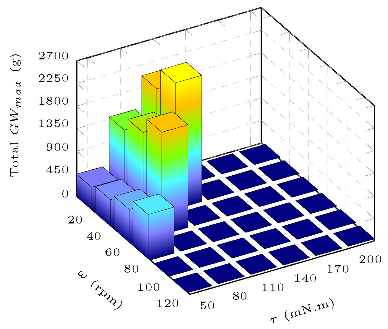 Хотя увеличение 𝜔 и 𝜏 улучшает способность к манипулированию, оно также значительно увеличивает повреждение томатов, особенно для томатов с большим диаметром. Поэтому, чтобы сбалансировать способность к манипулированию и гибкость, важно определить соответствующую комбинацию 𝜔 и 𝜏 для достижения оптимальных значений как для 𝐺𝑊𝑚𝑎𝑥, так и для d. Видно, что 𝐺𝑊𝑚𝑎𝑥 для большинства пластиковых шаров на Рисунке 12 намного выше, чем масса томатов на Рисунке 13, что указывает на то, что чрезмерно высокий 𝐺𝑊𝑚𝑎𝑥 не значительно помогает в обработке томатов. Чтобы максимизировать способность к манипулированию, обеспечивая при этом гибкость, были выбраны пары 𝜔−𝜏 с 𝑑=0, и была вычислена сумма 𝐺𝑊𝑚𝑎𝑥 одной и той же пары 𝜔−𝜏 в различных трех группах диаметров. Как показано на Рисунке 14, пара 40 об/мин–110 мН·м имеет наивысший общий 𝐺𝑊𝑚𝑎𝑥.