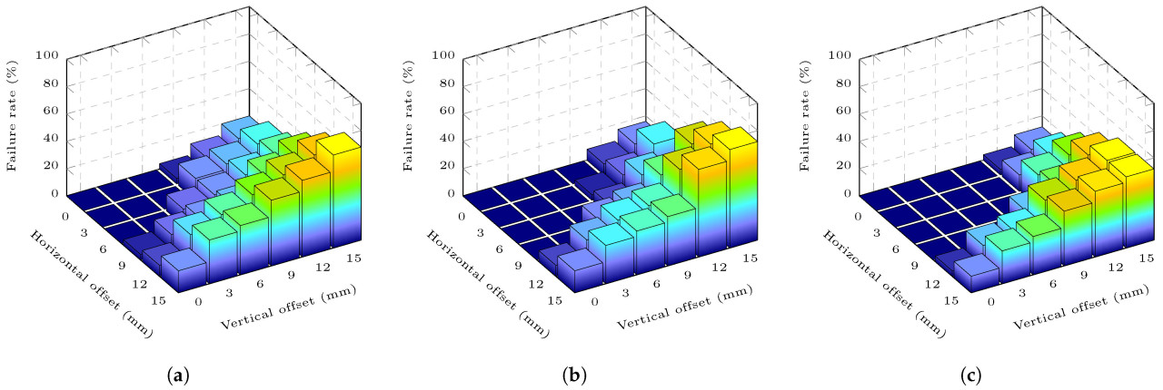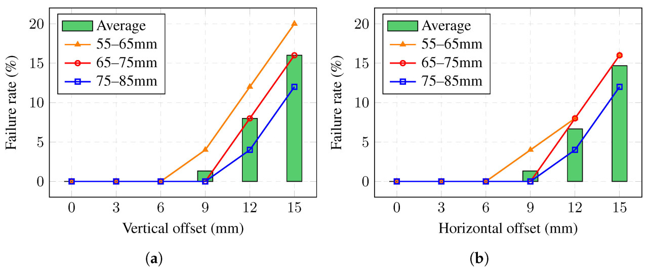 Производительность захвата ухудшается, когда применяются позиционные смещения в двусторонних направлениях (показано на Рисунке 17). Как показано на Рисунке 17a, процент неудач постепенно увеличивается с увеличением пар смещений. Границы пар горизонтально-вертикального смещения между 𝑓=0 и 𝑓≠0 в пределах диаметра 55–65 мм составляют 0–6 мм, 3–6 мм, 6–3 мм и 6–0 мм. Аналогично, границы в пределах диаметра 65–75 мм составляют 0–9 мм, 3–6 мм, 6–6 мм, 9–3 мм и 9–0 мм (показано на Рисунке 17b), и, в пределах диаметра 75–85 мм, составляют 0–9 мм, 3–9 мм, 6–9 мм, 9–6 мм, 9–3 мм и 9–0 мм (показано на Рисунке 17c). При паре 6–6 мм и 9–9 мм захват имеет средний процент неудач 4% и 18,67% соответственно, больше, чем 0% и 1,33% в одностороннем направлении. При паре 15–15 мм максимальные значения процента неудач в пределах диаметров 55–65 мм, 65–75 мм и 75–85 мм достигают 68%, 72% и 52% соответственно. В целом, хотя производительность захвата ухудшается в двусторонних направлениях, процент неудач все еще меньше 20% при паре смещений 9–9 мм.