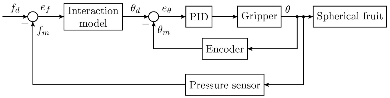 Как показано на Рисунке 18a, предложенный захват прикреплен к роботизированной руке. Томаты с ветвями закреплены на раме. Задача заключалась в управлении роботизированной рукой и захватом для сбора томатов с ветвей. Процесс управления рукой робота на основе камеры глубины показан на Рисунке 19. Камера глубины (D435, Intel RealSense) использовалась для захвата изображений и информации о глубине. Положение томата определялось YOLOv8 и Intel RealSense SDK 2.0. Затем было выполнено преобразование координат для преобразования координат камеры в координаты руки робота. После этого рука робота управлялась с помощью Unitree SDK, чтобы захват соприкоснулся с поверхностью томата (как показано на Рисунке 18b). Затем захват активировался, и томат перемещался в сторону захвата. Когда томат был собран в захват, пальцы захвата блокировались, и рука робота управлялась для движения назад, чтобы отделить томат от ветки. Для поддержания податливости использовался контроллер (показанный на Рисунке 20). В контроллере податливости ПИД-регулятор использовался в управлении движением для привода трех звеньев захвата к желаемым траекториям 𝜃𝑑𝑖, 𝑖=1,2,3 в то же время. Реальные углы и угловые скорости звеньев измерялись энкодерами. Учитывая, что спелые томаты обычно мягкие, импедансный контроллер был введен как прямая связь управления движением для регулировки скорости конца каждого звена. Фактическая сила между захватом и томатом задавалась датчиком давления; следовательно, захват собирал фрукт с соответствующей силой в соответствии с скорректированной угловой скоростью. Учитывая связь между томатом и веткой, захват управлялся для приложения силы 6 Н к томату, а скорость ролика была установлена на 120 об/мин. Во время эксперимента записывались процент успеха и процент повреждений для оценки производительности сбора. После эксперимента измерялись диаметр и количество томатов.