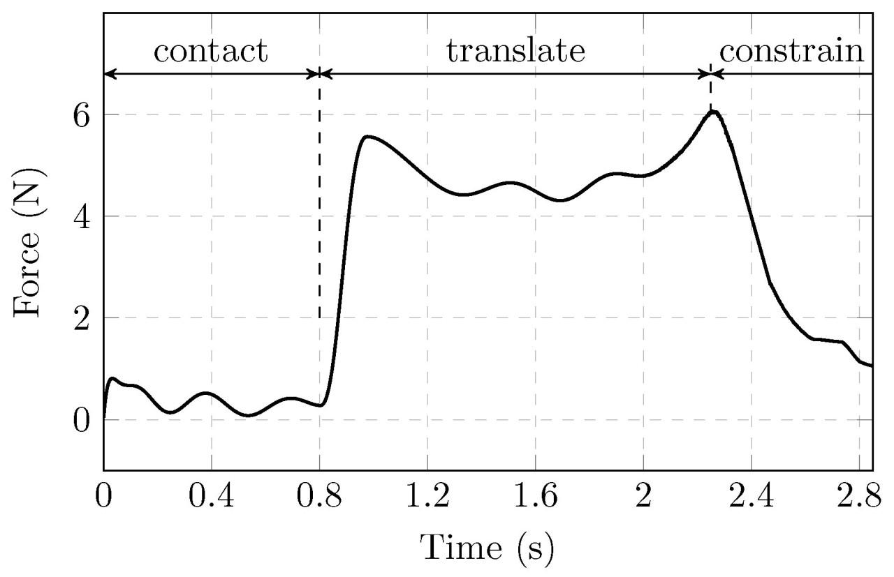 Типичная сила взаимодействия, записанная в эксперименте, показана на Рисунке 21. На стадии контакта регистрируется небольшая fluctuating сила, что может быть из-за неровной поверхности ролика. Затем, по мере перемещения фрукта, сила устойчиво увеличивается, пока не достигает установленного значения и остается в определенном диапазоне. Когда фрукт полностью ограничен, сила постепенно падает.