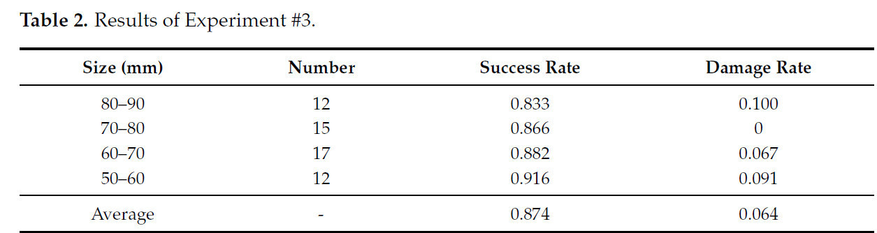 Всего в этом эксперименте было зарегистрировано 56 томатов с четырьмя диапазонами диаметров. Результаты эксперимента (показанные в Таблице 2. Результаты Эксперимента №3) указывают, что средний процент успеха составляет 0,874, что близко к Эксперименту №2 Раунд 1 (0,876). До того как быть полностью перемещенными в захват, четыре томата были замечены отделяющимися от ветвей и падающими на стол. Это показало, что связи между томатами и ветвями были не полностью надежными после транспортировки из теплицы в лабораторию. Три томата не были успешно отделены от ветвей, возможно, из-за различий в зрелости томатов. Кроме того, три томата были замечены поврежденными. Средний процент повреждений был рассчитан как 0,064. Были две причины: (1) попытки сбора были неадекватными, и (2) большая сила была приложена к томату, чтобы разорвать связывающую силу между томатом и веткой.