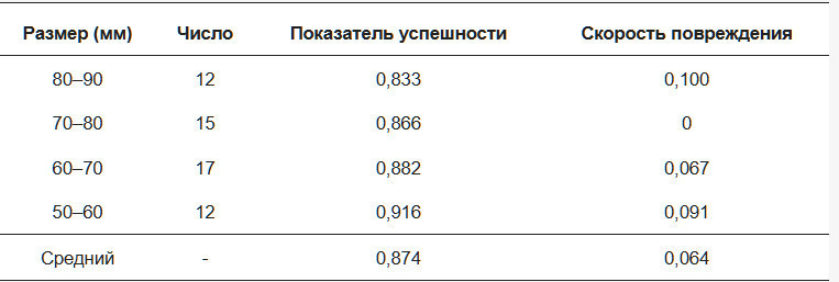 Установка для второго раунда была почти такой же, как в первом раунде. Однако целевые объекты были заменены на томаты трех диапазонов диаметров: 55–65 мм, 65–75 мм и 75–85 мм. В каждом диапазоне диаметров использовалось десять томатов. Основное внимание во втором раунде уделялось оценке процента повреждений (d) при разных парах 𝜔−𝜏, таким образом характеризуя гибкость захвата. Процент повреждений определялся как 𝑑=1−𝑝/𝑛. p представляло количество успешных попыток без значительных вмятин или видимых повреждений на поверхности томата. n было общим количеством успешных попыток. Процесс эксперимента для этого раунда оставался последовательным с первым раундом, обеспечивая совместный анализ 𝐺𝑊𝑚𝑎𝑥 и d.