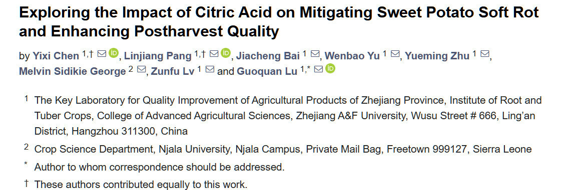 Chen Y, Pang L, Bai J, Yu W, Zhu Y, George MS, Lv Z, Lu G. Exploring the Impact of Citric Acid on Mitigating Sweet Potato Soft Rot and Enhancing Postharvest Quality. Agriculture. 2025; 15(2):215. https://doi.org/10.3390/agriculture15020215