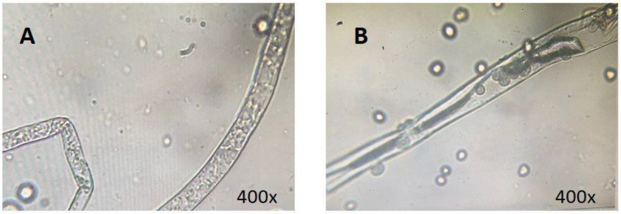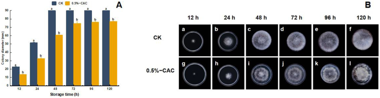 Рисунок 2. Оценка морфологии мицелия Rhizopus stolonifer после 5 дней инкубации. Сравнение между контрольной группой (CK) (A) и группой обработки 0,5% в/в CAC (B).