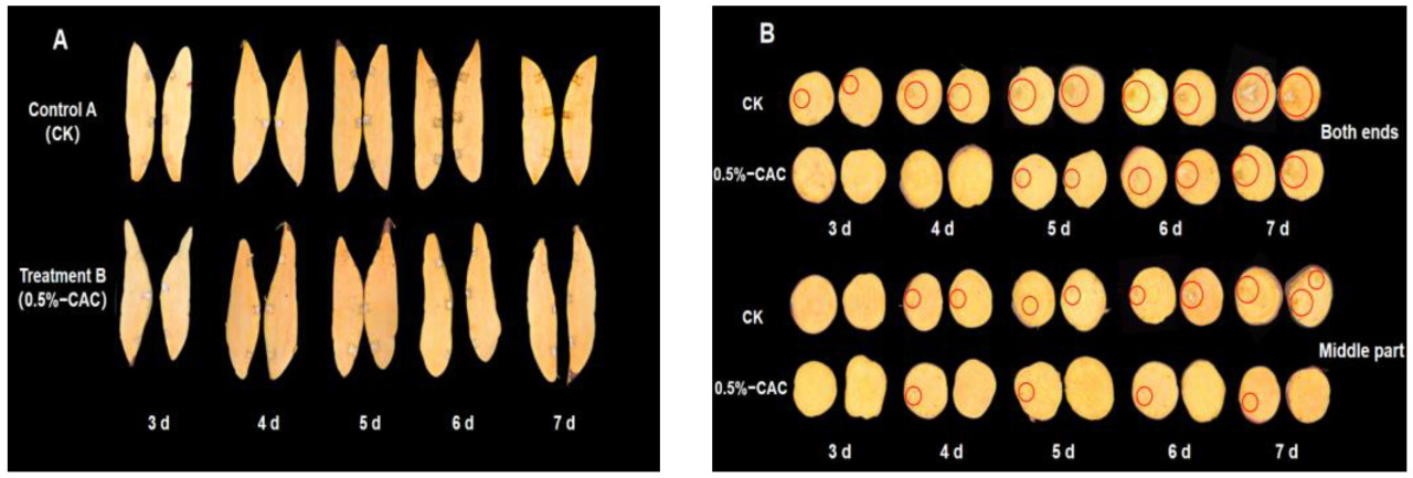 Фенотип является прямым отражением генетических признаков и условий окружающей среды организмов. Оценка эффективности борьбы с болезнями, сохранности и хранения может быть эффективно проведена через фенотипическое наблюдение [26]. Исследовалось прогрессирование болезни в различных тканях батата после заражения Rhizopus stolonifer. При обследовании продольных срезов наблюдалось минимальное распространение пятен болезни, причем первичным способом заражения было боковое, а не вертикальное (Рисунок 3A). Поперечное сечение инокулированных участков клубней батата выявило отчетливые закономерности развития болезни. В частности, на 3-й день после инокуляции коричневое обесцвечивание появилось на концах клубней в контроле, в то время как центральная область оставалась незатронутой. К 7-му дню признаки гнили стали очевидны на обоих концах, а средняя часть показала признаки потемнения. После обработки 0,5% в/в CAC расширение поражений было сокращено через все участки клубня, в отличие от контрольных клубней, у которых наблюдалось прогрессирующее развитие поражений, изменение цвета тканей и последующий внутренний распад (Рисунок 3B). В этом исследовании результаты подчеркивают эффективность 0,5% в/в CAC в снижении инфекций Rhizopus stolonifer и сокращении заболеваемости мягкой гнилью. Выдвигается гипотеза, что изменение размера пятен болезни может быть связано с отсроченной активацией некоторых защитных механизмов у батата сразу после обработки 0,5% CAC.