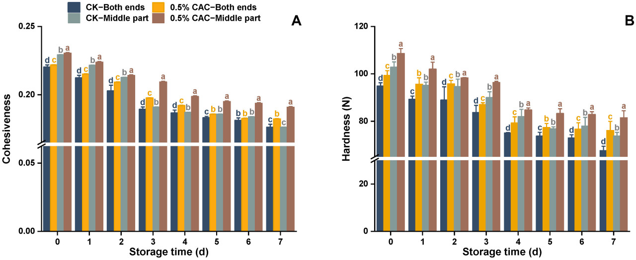 Твердость и связность являются ключевыми показателями текстуры, характеризующими сопротивление материала деформации и его внутреннюю прочность сцепления. Zhao и др. [27] обнаружили, что большая твердость у батата была связана с более сильной устойчивостью к мягкой гнили. В этом исследовании наблюдались сходные результаты (Рисунок 4). Контрольная группа испытала быстрое снижение текстурных характеристик после 2 дней, тогда как группа, обработанная 0,5% в/в CAC, проявляла более медленную скорость деградации текстуры, с значительным размягчением только после 3 дней. К 7-му дню батат, подвергнутый обработке 0,5% в/в CAC, сохранял на 3,57% и 4,88% большую связность в средней части и на обоих концах соответственно, чем в контроле (Рисунок 4A). Соответственно, твердость в обработанных CAC клубнях была повышена на 12,58% и 10,42% в средней и обеих конечных секциях по сравнению с контролем (Рисунок 4B). Батат, обработанный 0,5% в/в CAC, проявлял лучшие текстурные характеристики, что позволяет предположить, что эта обработка может улучшить устойчивость к мягкой гнили, поддерживая текстурные характеристики.