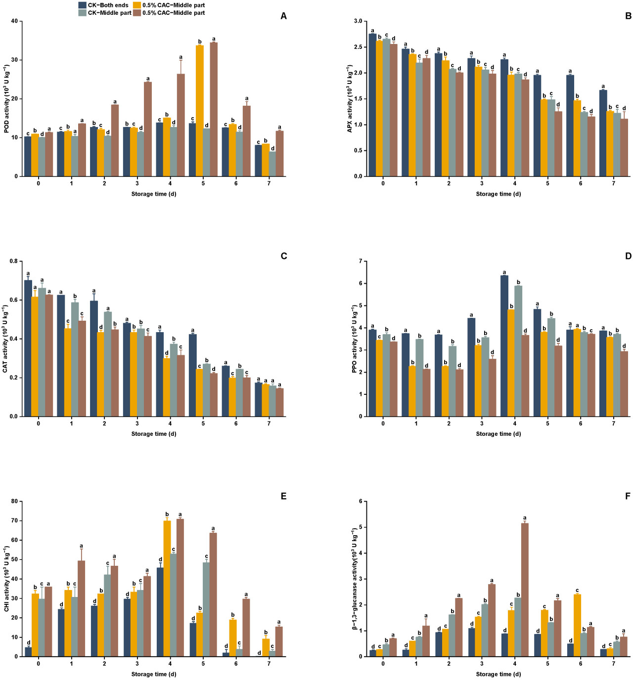 Рисунок 5. Активность ферментов, связанных с защитой, оценивалась в различных группах обработки батата в течение 7 дней хранения. Анализировались следующие ферменты: POD (A), APX (B), CAT (C), PPO (D), CHI (E) и GLU (F). Статистически значимые различия (p < 0,05) между средними значениями обозначены буквами над столбцами гистограммы.