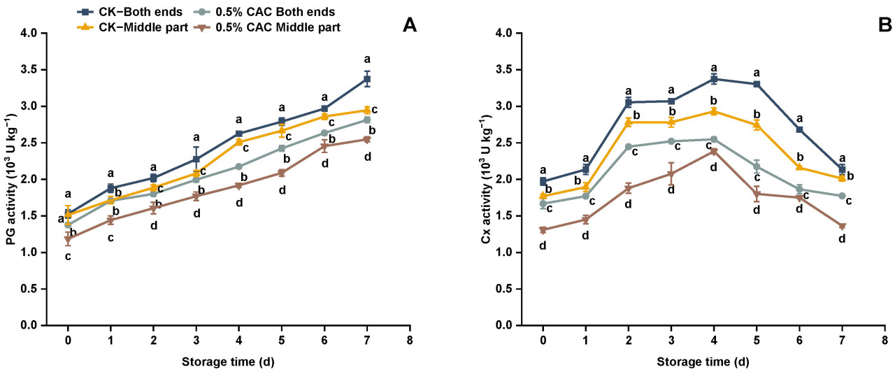 Рисунок 6. Активность PG (A) и Cx (B) в различных группах обработки батата в течение 7 дней хранения. Статистически значимые различия между средними значениями (p < 0,05) обозначены буквами над графиком.