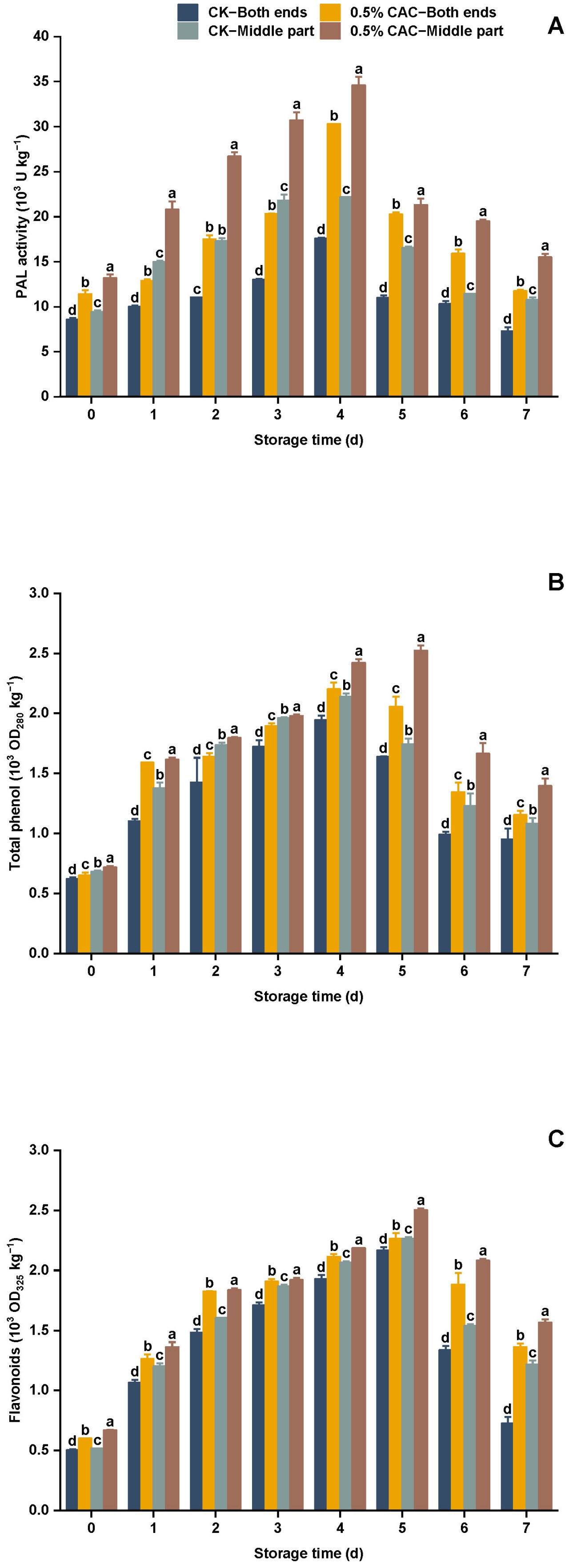 Рисунок 7. Изменения активности PAL (A), содержания общих фенолов (B) и флавоноидов (C) в различных группах обработки батата в течение 7 дней хранения. Статистически значимые различия (p < 0,05) между средними значениями обозначены буквами над столбцами гистограммы.