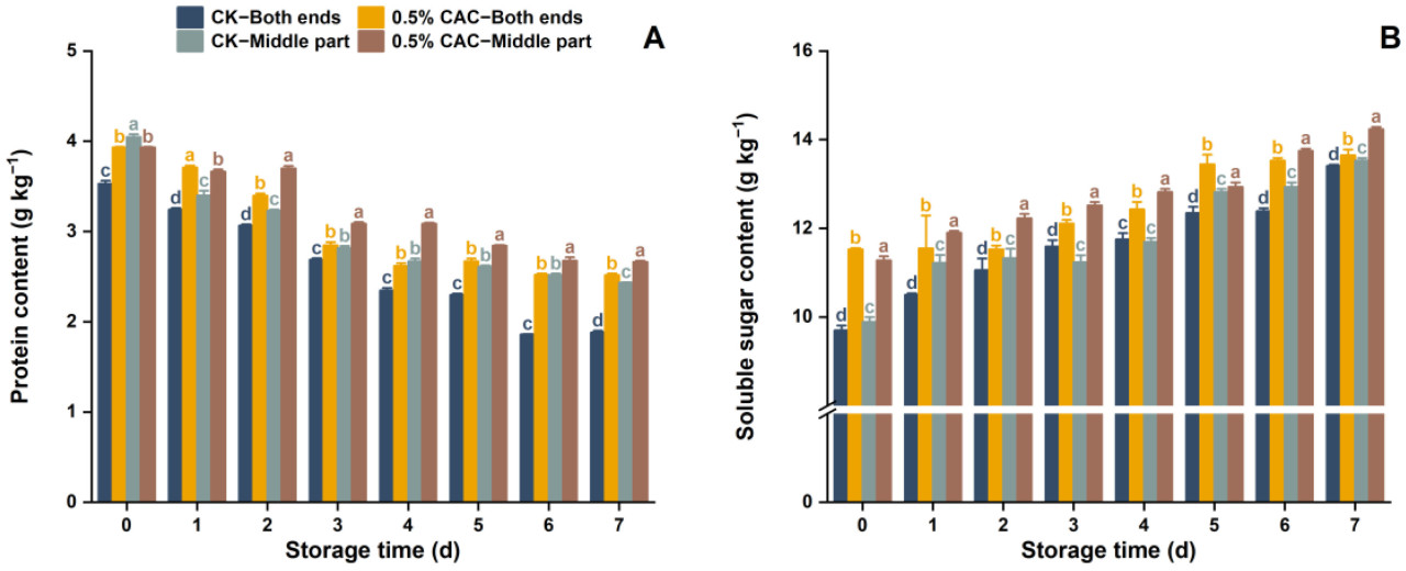 Рисунок 8. Изменения содержания белка (A) и растворимых сахаров (B) в различных участках клубня батата в течение 7 дней хранения в контрольных условиях и при обработке 0,5% в/в CAC. Статистически значимые различия (p < 0,05) между средними значениями обозначены буквами над столбцами гистограммы.