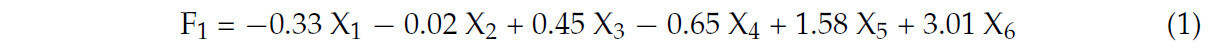Характеристический вектор коэффициента главной компоненты был получен путем деления коэффициента нагрузки на соответствующий характеристический корень, как подробно описано в Таблице 3. Линейные дисперсии трех главных компонент и уравнение комплексной оценки получены следующим образом: