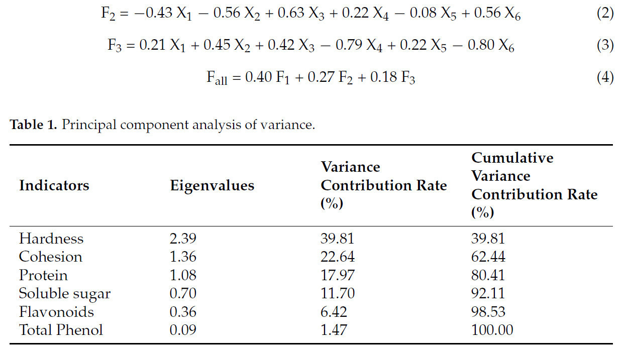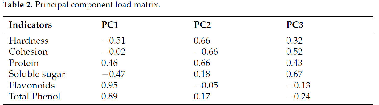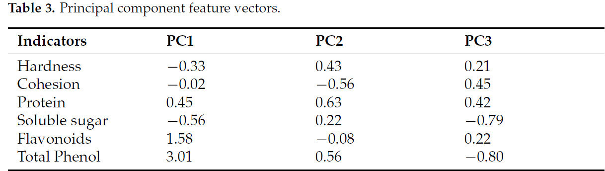 Анализ главных компонент (PCA): PCA проводили для упрощения размерности набора данных и оценки значимости различных атрибутов качества. Ключевые показатели качества батата включали твердость, связность, содержание белка, уровень растворимых сахаров, общие фенолы и флавоноиды. Методику PCA модифицировали на основе подхода, подробно описанного Sun и др. [23].