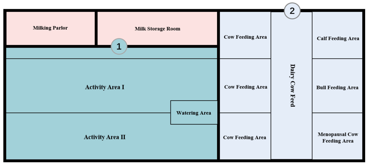 Две сетевые камеры, Dahua P40A20-WT-1 (Da Hua Technology, Ханчжоу, Китай) и Xiaomi Smart Camera 3 Pan and Tilt Edition (Xiaomi Technology, Шанхай, Китай), использовались для съемки зон активности и кормления коров, захватывая такие поведенческие акты, как прием пищи, питье, стояние и лежание. Зона кормления коров занимает примерно 200 м². Вторая камера была установлена на внутренней стене, на высоте 3.5 м над землей, в центре зоны, захватывая зону кормления коров с высоты птичьего полета для записи поведения кормления в помещении. Схематическая диаграмма установки камеры в зоне кормления в помещении представлена на Рисунке 2a. Зона активности коров занимает примерно 600 м². Камера была установлена на внешней стене доильного зала, на высоте 2.8 м над землей, в центре поля, захватывая зону активности коров с высоты птичьего полета для записи поведения стояния, питья и лежания на улице. Схематическая диаграмма установки камеры в зоне активности проиллюстрирована на Рисунке 2b.