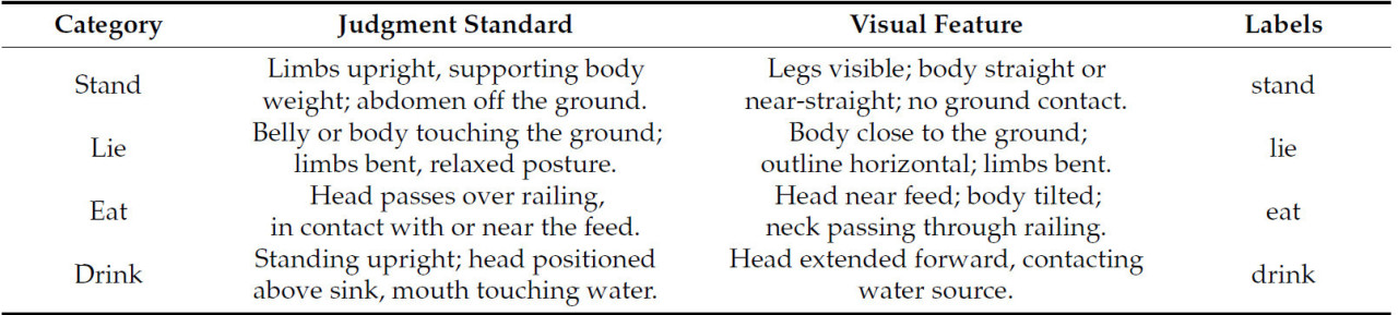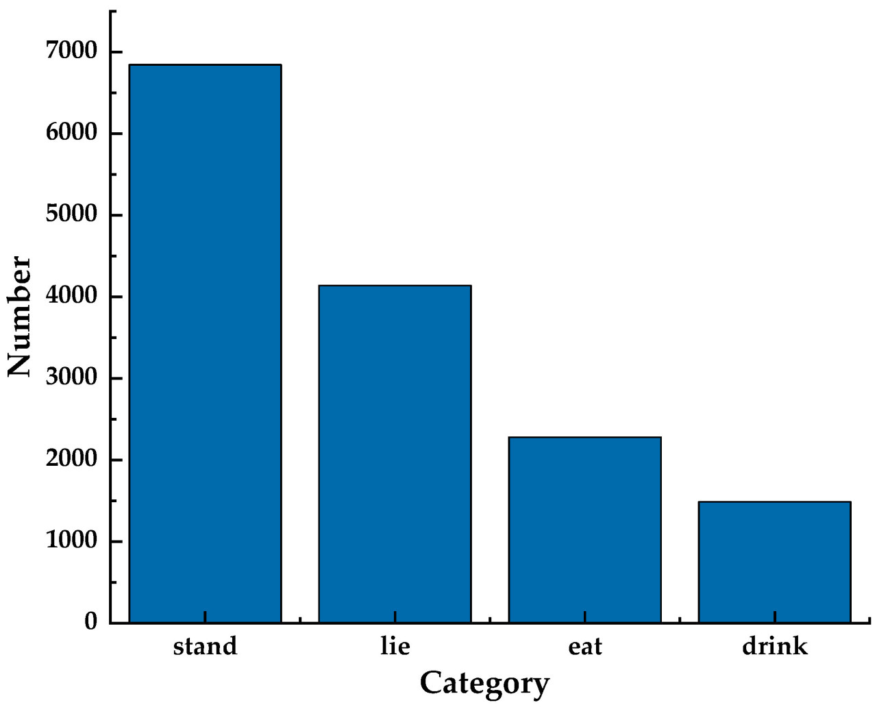 Таблица 2 описывает четыре поведения коров и соответствующие данные. Когда корова стоит, все четыре ноги прямые, поддерживая вес, живот находится на расстоянии от земли, тело в вертикальном положении, голова либо горизонтальна, либо опущена. Когда корова лежит, живот, грудь или часть тела касаются земли, конечности согнуты, поза расслаблена, голова лежит плоско или слегка приподнята, корова лежит горизонтально. Когда корова ест, конечности прямые, голова опущена, проходит через ограждение, и рот касается или находится близко к корму. Когда корова пьет, конечности прямые, поддерживая вес, голова находится над поилкой, и рот касается поверхности воды. На основе определений в Таблице 2, набор данных был размечен, в результате чего получилось 14,754 поведенческих актов, включая стояние (6845), лежание (4139), прием пищи (2280), и питье (1490). На Рисунке 4 представлено сравнение статистики меток. Коровы наиболее часто наблюдались стоящими, в то время как прием пищи и питье были наименее частыми поведениями. Это распределение closely mirrors наблюдаемое в реальных условиях фермы и соответствует требованиям для анализа поведения коров в сложных условиях.