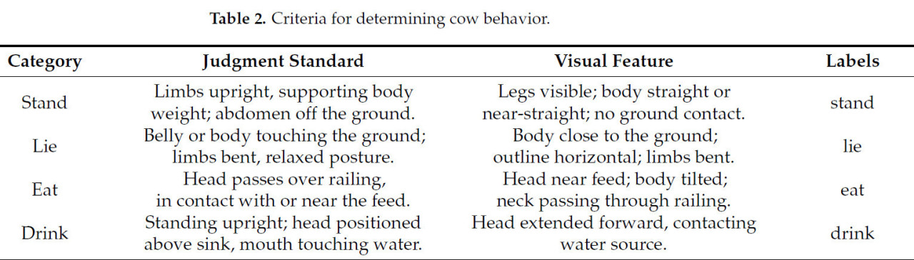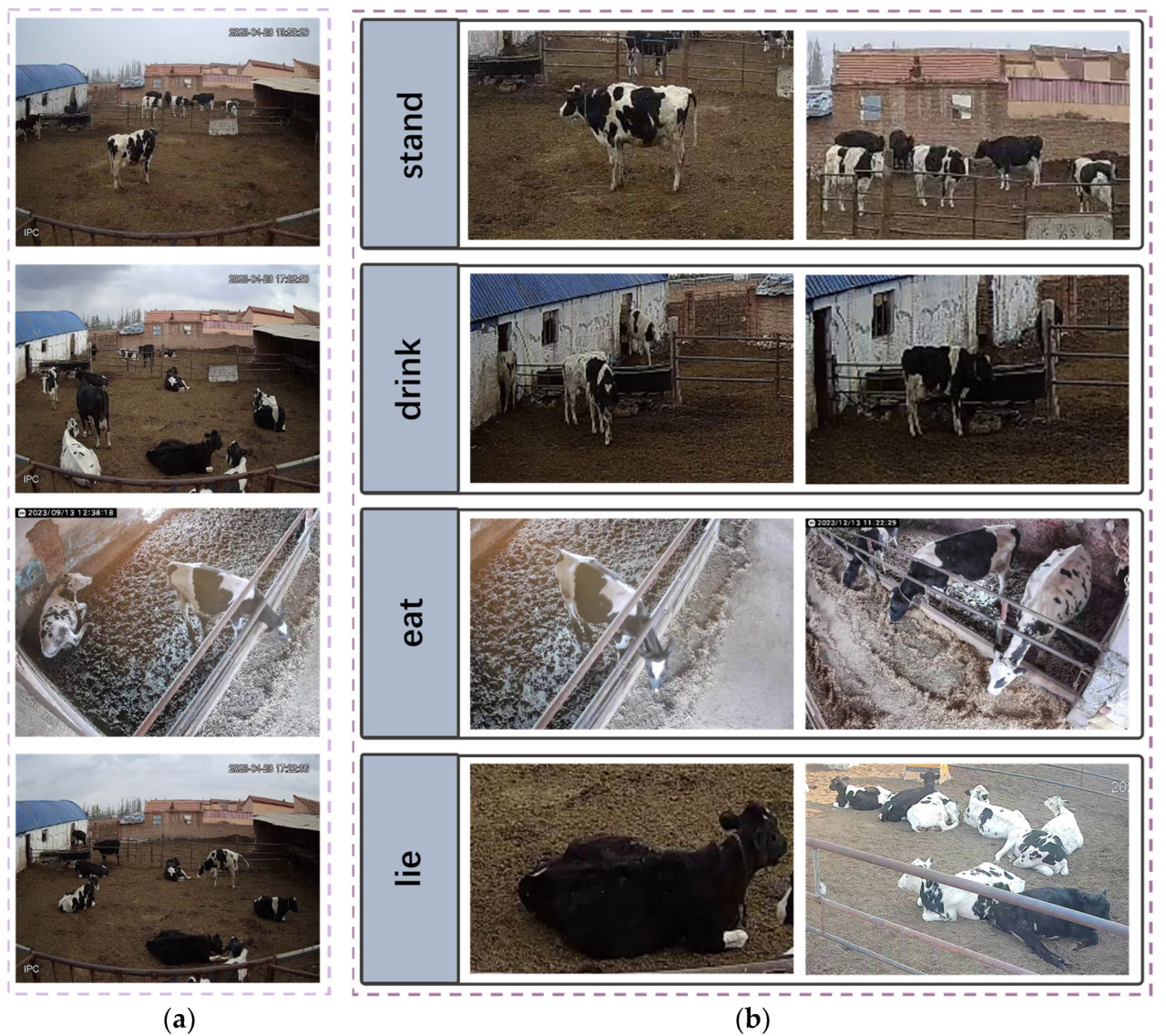 В данном исследовании в качестве объектов исследования участвовали 38 коров голштинской породы. Видеозаписи поведения коров собирались с апреля по декабрь 2023 года. Всего было отобрано 1044 видео с поведением коров, comprising 1008 коротких видео продолжительностью примерно 5 минут и 36 более длительных видео ranging от 0.5 до 3 часов, с разрешением 1920 × 1080 пикселей и частотой кадров 25 кадров/с. Чтобы уменьшить вычислительную нагрузку, повысить эффективность и обеспечить захват необходимой информации для задач распознавания, были implemented следующие video processing steps. First, кадры были извлечены из всех видеоклипов с использованием OpenCV, с частотой дискретизации каждые 25 кадров. Эта стратегия дискретизации минимизирует избыточные кадры и снижает вычислительные потребности. Next, основные поведения коров были размечены с использованием LabelImg. Метки included стояние (stand), лежание (lie), прием пищи (eat), и питье (drink). После фильтрации и обобщения, всего было размечено 3458 изображений. Набор данных был случайным образом разделен в соотношении 8:1:1 для создания обучающего набора (2766 изображений), проверочного набора (346 изображений), и тестового набора (346 изображений) для обучения модели и оценки. Пример поведения коров проиллюстрирован на Рисунке 3. Рисунок 3a изображает многомасштабное поведение коров в различных сценах и сложных фонах, включая поведения на both long и short расстояниях. Рисунок 3b представляет четыре примера поведения коров: стояние, питье, прием пищи, и лежание. Четыре поведения, relevant к оценке здоровья коров, были выбраны в качестве объектов исследования: стояние, лежание, питье, и прием пищи. Критерии определения поведения коров представлены в Таблице 2. Критерии определения поведения коров [34].