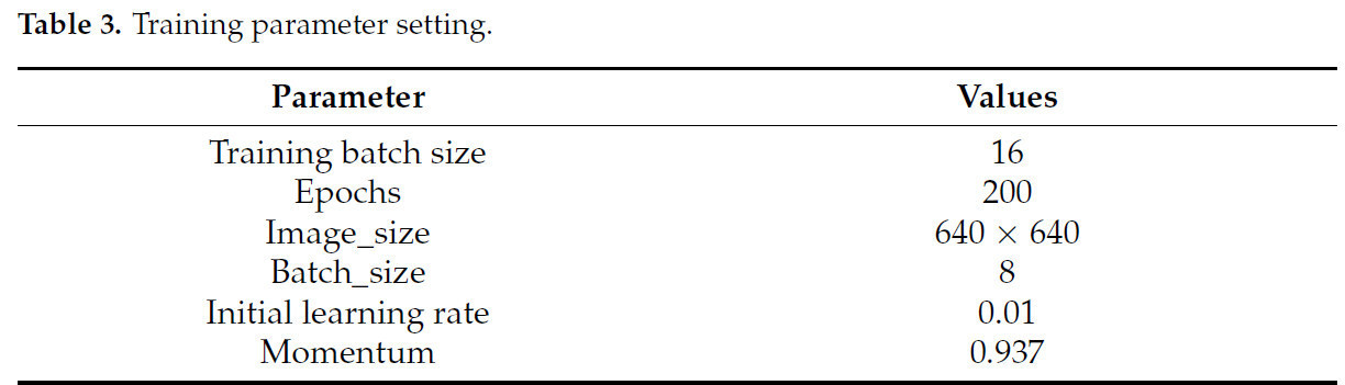 Вычислительная платформа, использованная в данном исследовании, состояла из 12-го поколения Intel® Core™ i7-12700H CPU (Intel Corporation, Санта-Клара, Калифорния, США) процессора с тактовой частотой 2.30 ГГц, 24 ГБ ОЗУ, 1 ТБ SSD-накопителя, и видеокарты NVIDIA GeForce RTX 3070 с 16 ГБ видеопамяти. Программная среда included операционную систему Windows с установленными CUDA 12.1 и Python 3.9. Дополнительно, фреймворк глубокого обучения PyTorch 2.1.0 был использован в данном эксперименте. Технические характеристики аппаратного обеспечения подробно описаны в Таблице 3. Установка параметров обучения. Все алгоритмы сравнения были запущены в той же среде. Настройки параметров обучения сети показаны в Таблице 3 согласно условиям тестирования.