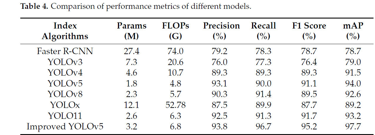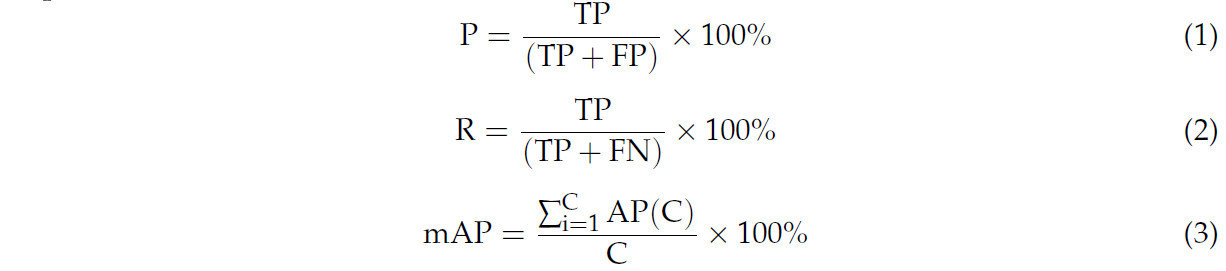 Чтобы проверить производительность этой улучшенной модели, в данном исследовании используются Точность (Precision, P), Полнота (Recall, R), Средняя Точность (Average Precision, AP), Средняя Средняя Точность (mean Average Precision, mAP), Params, Операции с плавающей запятой (Floating Point operations, FLOPs), и F1 Score. F1 Score - это показатель, используемый для оценки производительности модели классификации, объединяющий Точность и Полноту. Когда весовой коэффициент α = 0.5, по сравнению с commonly used F1 Score, P более важна, чем R и имеет удвоенный вес по сравнению с R. mAP50 относится к AP, рассчитанному для всех изображений в каждой категории, когда порог установлен на 0.5, а затем усредненному по всем категориям. mAP50-95 относится к AP, рассчитанному для всех изображений в каждой категории, когда порог установлен на 0.5–0.95, а затем усредненному по всем категориям. Вычисления P, R, и mAP показаны в Уравнениях (1)–(3) [35].