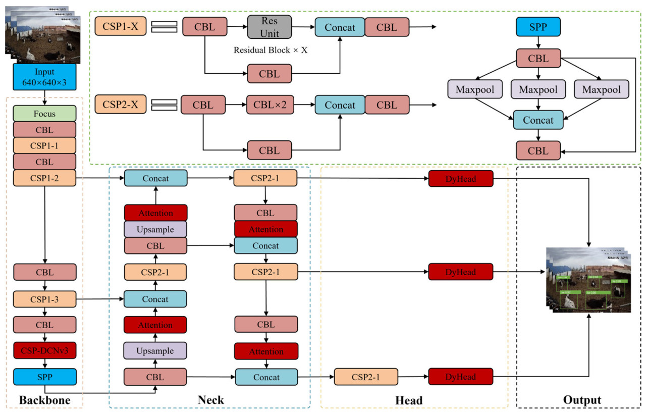 Данное исследование направлено на повышение точности распознавания и обнаружения поведения коров в сложных условиях, смягчение влияния целей различных масштабов на результаты распознавания и улучшение производительности модели при идентификации множественного поведения. В данное исследование интегрирован SA [31], который объединяет механизмы внимания по каналам и пространственному вниманию для усиления фокуса модели на областях поведения, эффективного подавления интерференции сложного фона и усиления глубокого извлечения признаков и внимания к мелкомасштабным целям. Модуль C3 был улучшен за счет включения DCNv3 [32], что позволяет модели адаптироваться к вариациям масштаба цели и сложности формы и повышает точность идентификации характеристик поведения коров. Наконец, для улучшения производительности головы обнаружения исходная голова обнаружения была заменена на DyHead [33], что позволяет обеспечить эффективное и точное обнаружение поведения коров в различных масштабах в сложных условиях. Модель YOLOv5 была оптимизирована для улучшения ее способности обнаружения многомасштабных целей в сложных условиях, с целью улучшения распознавания поведения коров.