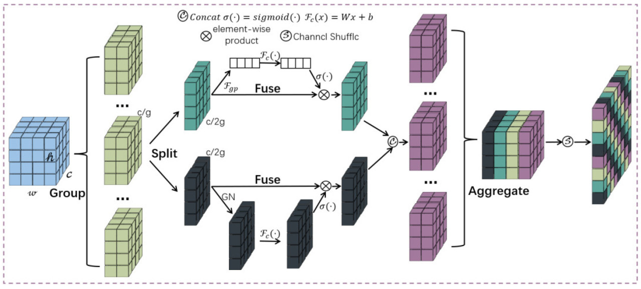 Shuffle Attention (SA) - это гибридный механизм внимания, который интегрирует механизмы внимания каналов и пространственного внимания. Он группирует входные карты признаков и независимо выполняет операции свертки внутри каждой группы. Он способствует обмену и слиянию признаков между группами через операции перетасовки каналов и использует стратегию двойного внимания для улучшения разнообразия признаков и выразительности, enabling более точный захват деталей изображения и контекстуальной информации [36]. Учитывая богатое и разнообразное поведение коров, каждое поведение exhibits отличительные характеристики на изображении. SA усиливает чувствительность модели к мелкомасштабному поведению коров, улучшает богатство и точность выражения признаков, и позволяет более точно захватывать ключевые поведенческие признаки, thereby повышая производительность многомасштабного распознавания поведения коров в сложных фонах. Структура модуля SA проиллюстрирована на Рисунке 6.