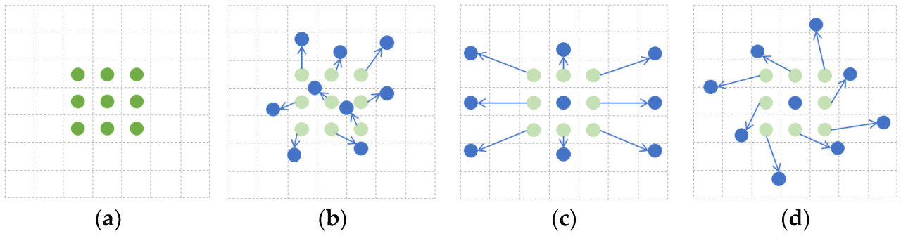 Рисунок 7. Принцип деформируемой свертки. (a) Обычная свертка; (b) деформируемая свертка; (c) специальная деформируемая свертка; (d) специальная деформируемая свертка. Зеленый indicates точки выборки регулярной свертки, и синий indicates динамически выбираемые точки деформируемой свертки.