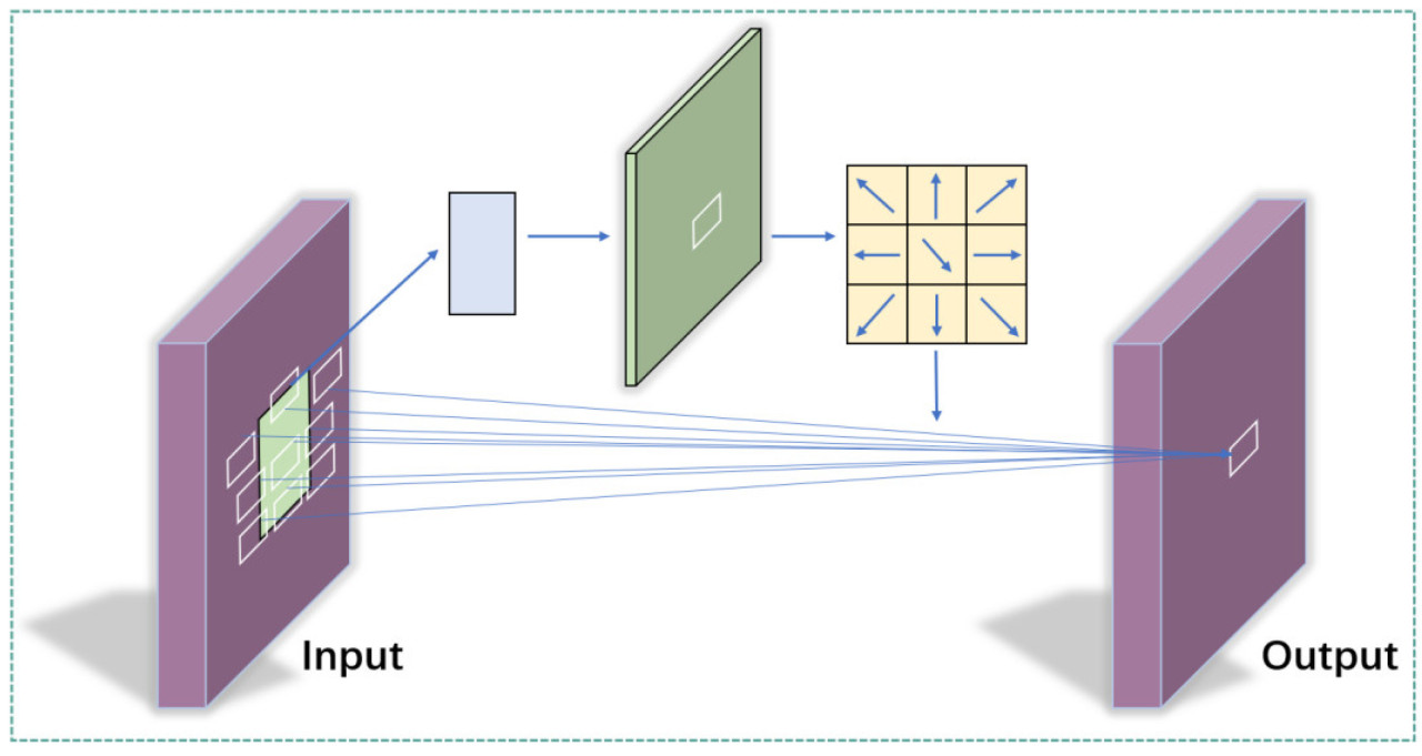 DCNv3 интегрирует разреженный механизм внимания со сверткой для обработки каждой выходной позиции скользящим оконным способом. Он динамически samples точки с адаптивным диапазоном и агрегирует пространственные признаки, используя веса внимания, зависящие от входа. Это позволяет модели более эффективно фокусироваться на коровах и relevant областях признаков в сложных фонах, адаптивно регулировать рецептивное поле на основе изменений фона, позиции коровы и позы, и улучшать извлечение признаков и устойчивость в сложных условиях. Принцип деформируемой свертки проиллюстрирован на Рисунке 7.